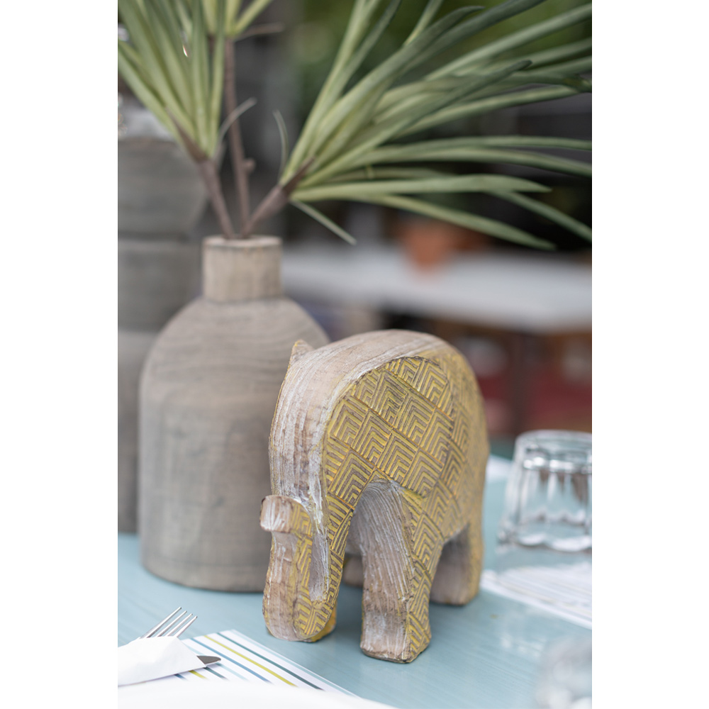 Το διακοσμητικό ελεφαντάκι AFRICANA 2 από πολυρεζίνη, διαστάσεων 29x13x22cm, ξεχωρίζει για τον έντονο κίτρινο χρωματισμό και τα γεωμετρικά μοτίβα που θυμίζουν αφρικανική τέχνη. Με προσεγμένες λεπτομέρειες και ζεστό φινίρισμα, αποτελεί ιδανικό στοιχείο για ethnic, boho ή και εκλεκτικά στυλ διακόσμησης. Ιδανικό για τοποθέτηση σε ράφια, κομοδίνα ή επιφάνειες προβολής, προσδίδει χρώμα και χαρακτήρα στον χώρο.