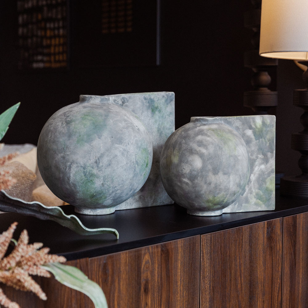 Τα κεραμικά βάζα Alkistis, συνδυάζουυν σύγχρονο σχεδιασμό με καλλιτεχνική φινέτσα. Η γκρι μαρμάρινη υφή τους, εμπλουτισμένη με απαλές αποχρώσεις, προσθέτει διακριτική κομψότητα και αρμονία στον χώρο σας. Η ασύμμετρη γεωμετρική μορφή τους ταιριάζει απόλυτα σε μοντέρνους ή minimal χώρους. Είναι ιδανικά για χρήση ως αυτόνομα διακοσμητικά ή σε συνδυασμό με άλλα αντικείμενα της πλούσας συλλογής μας για μια ξεχωριστή σύνθεση. Αποκλειστικά διακοσμητική χρήση – δεν ενδείκνυται η χρήση νερού.