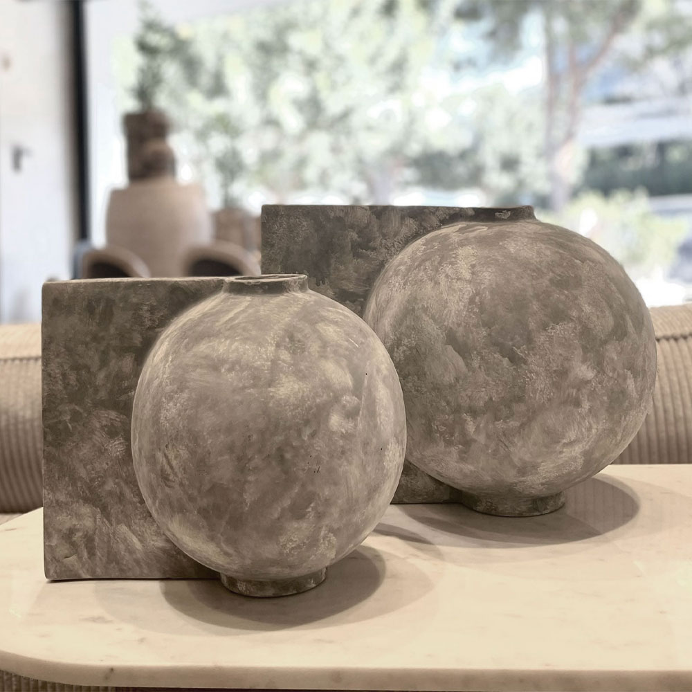 Τα κεραμικά βάζα Alkistis, συνδυάζουυν σύγχρονο σχεδιασμό με καλλιτεχνική φινέτσα. Η γκρι μαρμάρινη υφή τους, εμπλουτισμένη με απαλές αποχρώσεις, προσθέτει διακριτική κομψότητα και αρμονία στον χώρο σας. Η ασύμμετρη γεωμετρική μορφή τους ταιριάζει απόλυτα σε μοντέρνους ή minimal χώρους. Είναι ιδανικά για χρήση ως αυτόνομα διακοσμητικά ή σε συνδυασμό με άλλα αντικείμενα της πλούσας συλλογής μας για μια ξεχωριστή σύνθεση. Αποκλειστικά διακοσμητική χρήση – δεν ενδείκνυται η χρήση νερού.