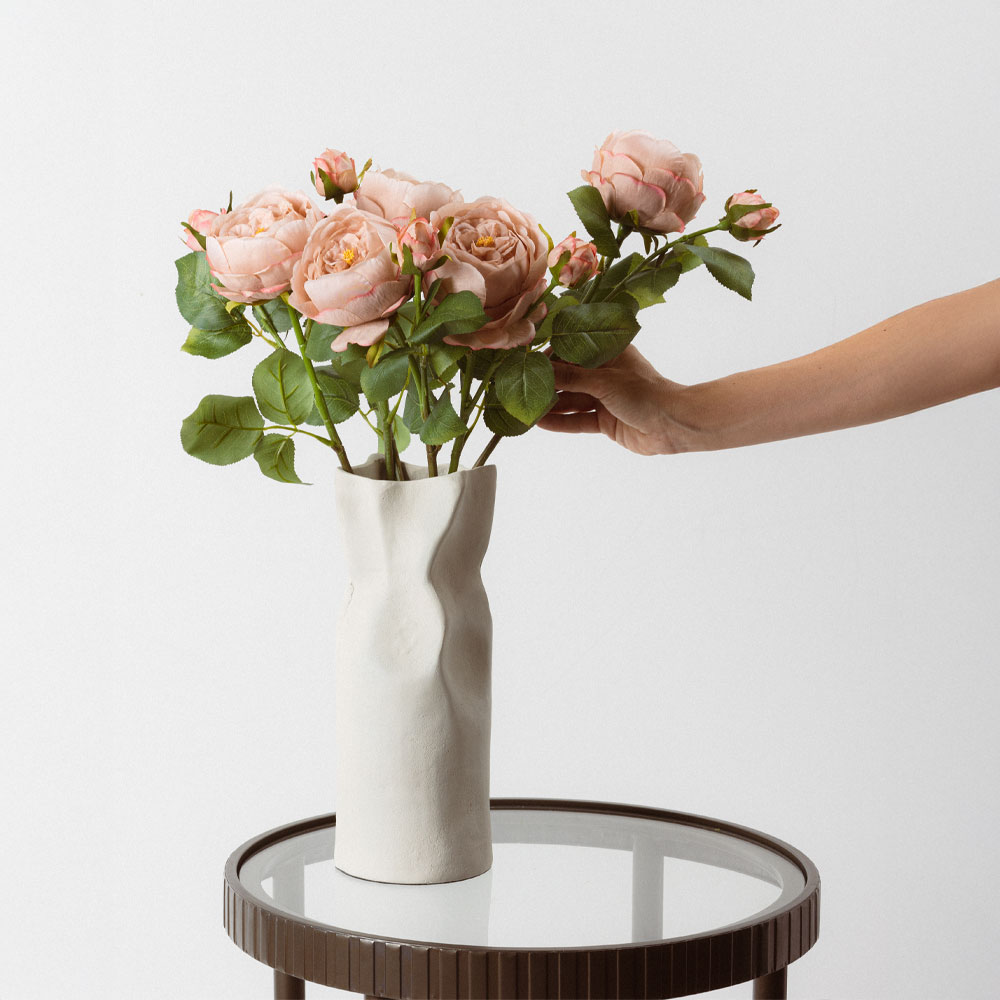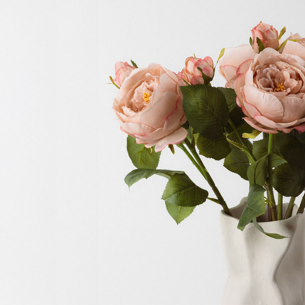 Το artificial σομόν λουλούδι AUSTIN ROSE 64cm με το όμορφο μπουκετάκι θα αναδείξει τη ρομαντική και vintage πλευρά της διακόσμησης κάθε οικιακού ή επαγγελματικού χώρου. Με τα αληθοφανή φύλλα του από πολυεστέρα, το τεχνητό λουλούδι θα γεμίσει το δωμάτιο, μόνο του ή σε υπέροχες ανθοσυνθέσεις, με θετική αύρα και ένα πιο elegant στυλ που θα συζητηθεί.
