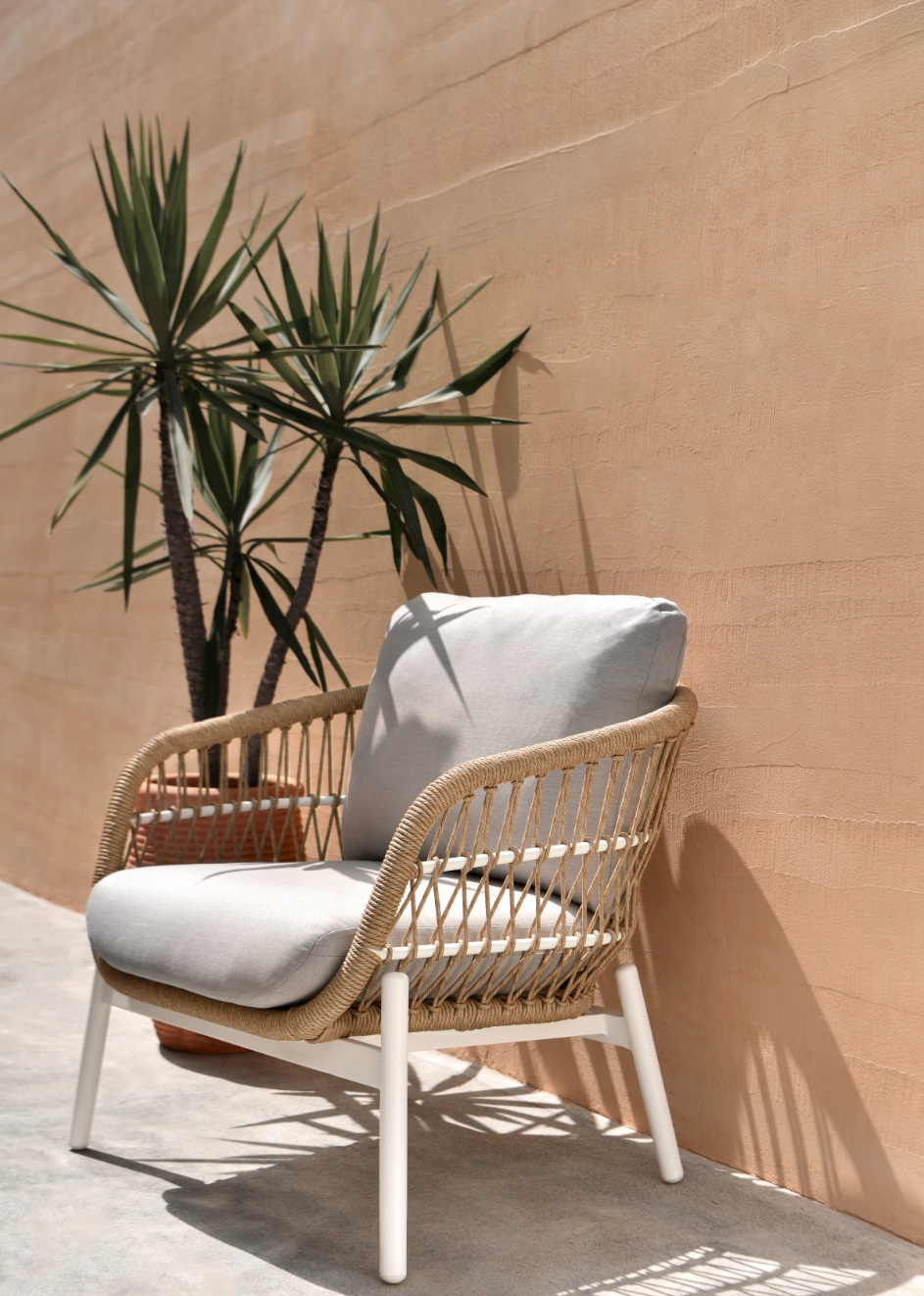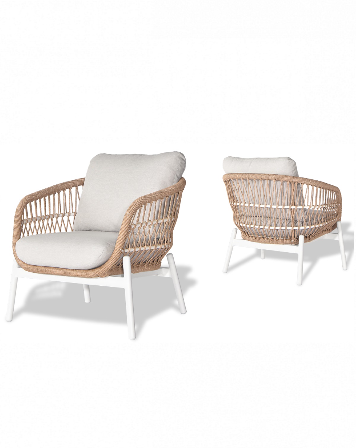 – Μαξιλάρια πλάτη-κάθισμα σε coconut (ανοικτό γκρι) outdoor ύφασμα. Δεν συμπεριλαμβάνονται διακοσμητικά μαξιλάρια.