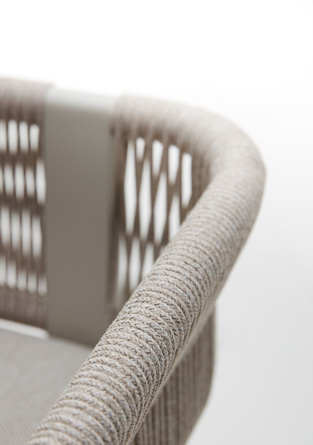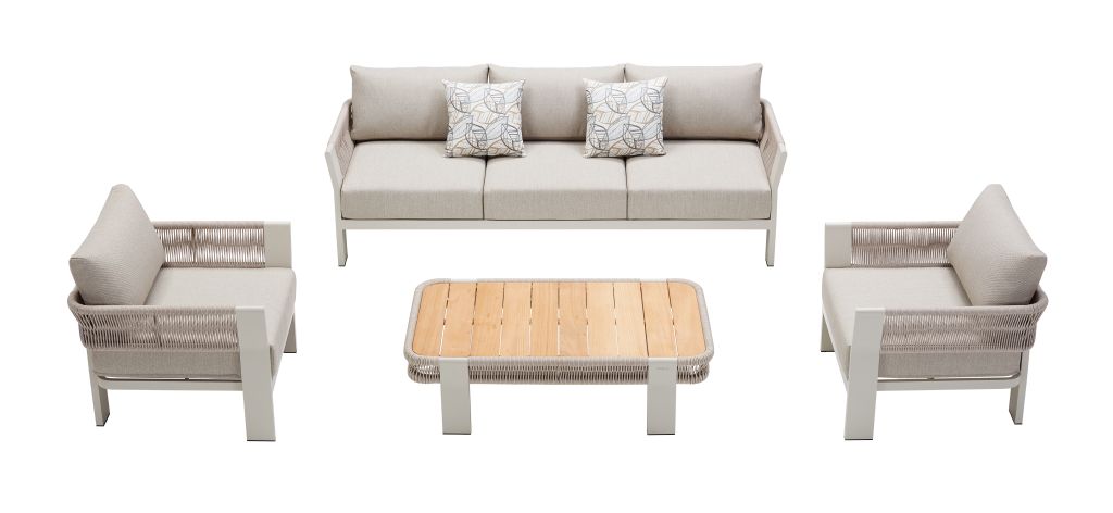 Ένα ταξίδι στην Ευρώπη το καλοκαίρι και παρατηρώντας τις υπέροχες μπλε αντανακλάσεις της Μεσογείου, η ιδέα είναι εμπνευσμένη και διαμορφωμένη με την αίσθηση που σε ταξιδεύει σε μια ηλιόλουστη μέρα κοντά στη θάλασσα με ένα απαλό αεράκι που φυσάει. Η συλλογή Borromeo είναι ένα αποτέλεσμα που συνδυάζει την εμπειρία και την τεχνογνωσία της HIGOLD με φυσικά και αγνά στοιχεία σε τέλεια αρμονία. Αυτή η μοναδική συλλογή είναι όπου η απλότητα του φυσικού σχοινιού συνδυάζεται με ακρίβεια με τις μοντέρνες γραμμές αλουμινίου για να ζωντανέψει μια αίσθηση που δεν μοιάζει με καμία άλλη. Συνδυάζοντας συμβατικό σχεδιασμό με ευχάριστη νοσταλγία! Η σκέδαση του ηλιακού φωτός από τα μόρια του νερού εμπνέει τις υφές και την αίσθηση αυτής της συλλογής και αποτελεί μια υπενθύμιση για χαλάρωση και ξεκούραση σε αυτήν. Ένα lounge set 4-τεμαχίων, αποτελούμενο από: 2 πολυθρόνες lounge διαστάσεων 81×76,5x60cm, 1 καναπέ lounge 3-θέσιο διαστάσεων 217×76,5x60cm και 1 τραπεζάκι καφέ με επιφάνεια teak διαστάσεων 120x70x35cm. Σκελετός αλουμινίου σε μπεζ χρώμα πλεγμένος με σχοινί. Μπεζ μαξιλάρια με outdoor ύφασμα. Τα ξύλινα μέρη είναι μασίφ ξύλο teak. Σχεδιασμένο από τον Claudio Bellini.