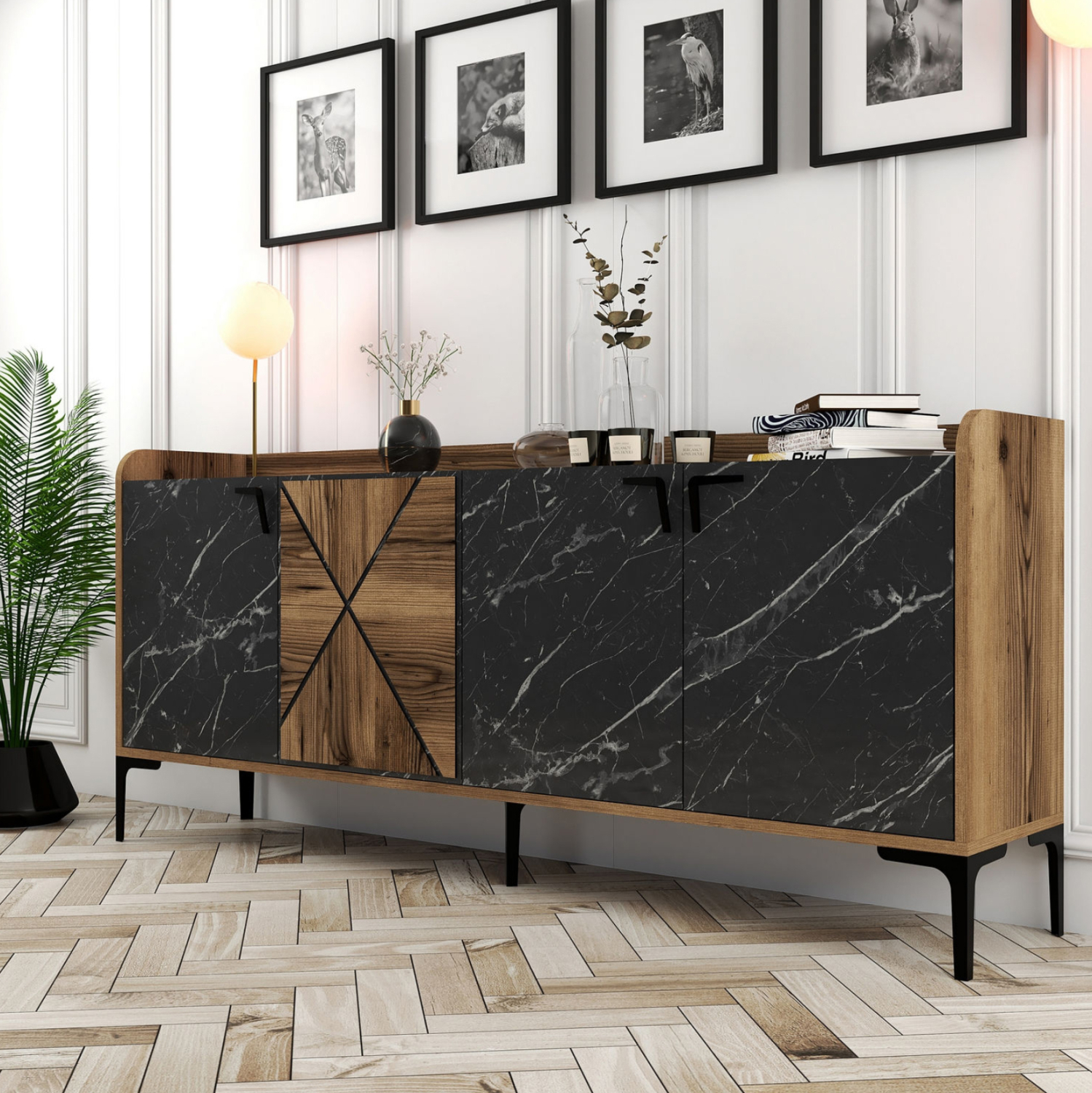 Ο μπουφές ΗΜ9433.03 είναι ένα επιβλητικό έπιπλο όπου κι αν τον τοποθετήσετε. Έχει ψηλά μαύρα μεταλλικά πόδια και δύο μεγάλα ντουλάπια που ανοίγουν με διπλές πόρτες με μεταλλικά μαύρα χερούλια. Το μήκος του εξασφαλίζει ότι η επιφάνεια του είναι μεγάλη και αρκετή για τοποθέτηση πολλών αντικειμένων. Το χρώμα όλης της κατασκευής είναι καρυδί, ενώ οι 3 από τις 4 πόρτες έχουν όψη ΜΑΥΡΟΥ ΜΑΡΜΑΡΟΥ. Ο μπουφές αυτός θα σας ενθουσιάσει! Τι είναι όμως ο μπουφές; Ο μπουφές είναι ένα άκρως πρακτικό έπιπλο, αφού στους αποθηκευτικούς του χώρους μπορούμε να βάλουμε από σερβίτσια πιάτων και ποτήρια, μέχρι κεριά και διάφορα άλλα χρηστικά αντικείμενα που έχουμε στο σπίτι μας, ώστε να είναι τακτοποιημένα και να μη δημιουργούν ακαταστασία στο χώρο.
