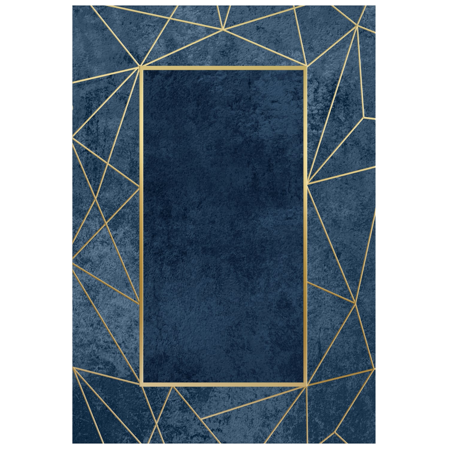 Αυτό το όμορφο και μοντέρνο χαλί έχει κυρίαρχα χρώματα το μπλε σε όλη την επιφάνεια του χαλιού, και το χρυσό σε όλες τις γραμμές της μπορντούρας. Το έντονο χαρακτηριστικό του είναι το μπλε ορθογώνιο στο κέντρο του χαλιού που μοιάζει με καθρέφτη με χρυσό πλαίσιο και χρυσά τριγωνικά σχέδια τριγύρω. Ένα μοντέρνο χαλί που θα τραβήξει τα βλέμματα και θα αναβαθμίσει αισθητικά το σαλόνι σας.