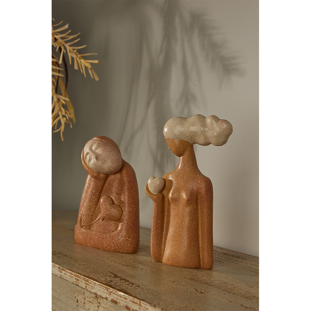 Ένα ρομαντικό και καλλιτεχνικό διακοσμητικό άγαλμα με φιγούρα σε ονειροπόληση, κρατώντας ένα καρδιόσχημο μπαλόνι. Η υφή τύπου πέτρας και οι γήινες αποχρώσεις του terracotta και του γκρι προσδίδουν αυθεντικότητα και ηρεμία. Ιδανικό για ραφιέρες, κονσόλες και διακόσμηση που αποπνέει συναίσθημα και μοντέρνα τέχνη.