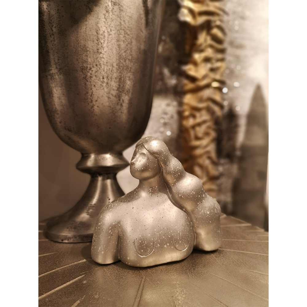 Μια μοντέρνα και αφαιρετική διακοσμητική φιγούρα σε ασημί χρώμα με γυαλιστερό φινίρισμα. Το άγαλμα απεικονίζει μια γυναικεία μορφή με έντονα καλλιτεχνικά χαρακτηριστικά και κυματιστά μαλλιά, αποτελώντας μια τολμηρή πρόταση για ραφιέρες, κονσόλες ή επιτραπέζιες διακοσμήσεις. Κατασκευασμένο από πολυρεσίνη για σταθερότητα και εντυπωσιακή εμφάνιση.