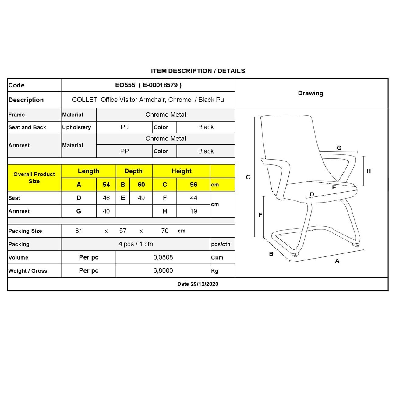 COLLET Πολυθρόνα Γραφείου Επισκέπτη Μέταλλο Χρώμιο, Pu Μαύρο