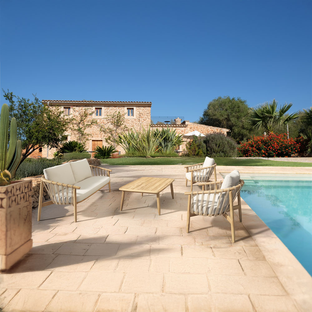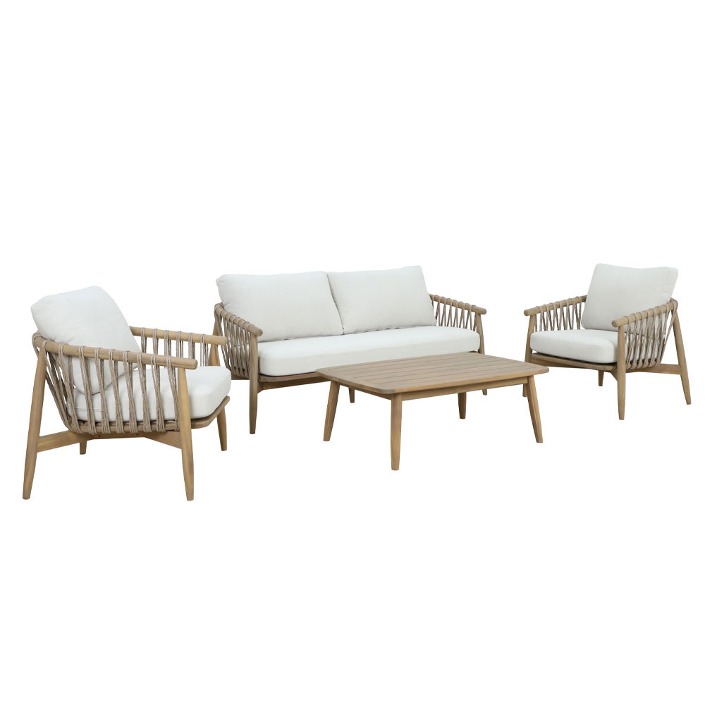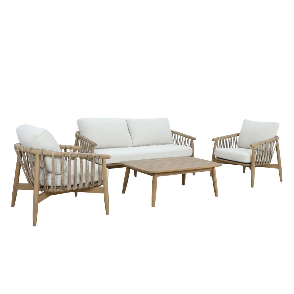 Το σετ σαλονιού Corda συνδυάζει την αυθεντικότητα του φυσικού ξύλου με τον αέρινο σχεδιασμό, δημιουργώντας έναν κομψό και φιλόξενο χώρο χαλάρωσης. Κατασκευασμένο από ξύλο ακακίας σε φυσική απόχρωση, αποπνέει ζεστασιά και διαχρονικότητα. Το σετ αποτελείται από καναπέ, δύο πολυθρόνες και τραπεζάκι σαλονιού, προσφέροντας άνεση και λειτουργικότητα. Τα μαξιλάρια σε λινό ύφασμα λευκού χρώματος εξασφαλίζουν πολυτελή αίσθηση και ξεκούραστο κάθισμα. Τα διακοσμητικά σχοινιά στην πλάτη και στα πλαϊνά ολοκληρώνουν τον σχεδιασμό με μια ιδιαίτερη, μοντέρνα πινελιά. Ιδανικό για εσωτερικούς και εξωτερικούς χώρους, το σετ Corda προσφέρει απαράμιλλη αισθητική και ποιότητα.