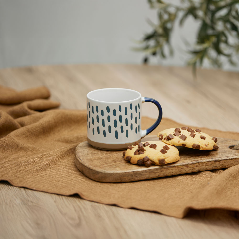 Η κούπα COZY συνδυάζει λευκή βάση με μοτίβα σε απόχρωση Midnight Blue και λεπτομέρειες σε μπεζ, δημιουργώντας μια ήρεμη αλλά σύγχρονη αισθητική. Το stoneware υλικό της χαρίζει στιβαρότητα, φυσική υφή και μια αίσθηση χειροποίητης ποιότητας. Η κομψή αντίθεση των χρωμάτων αποπνέει ζεστασιά, ιδανική για χαλαρές στιγμές στο σπίτι. Ένα αντικείμενο που ενώνει απλότητα και μοντέρνο χαρακτήρα, προσφέροντας μια ευχάριστη εμπειρία καθημερινής χρήσης.