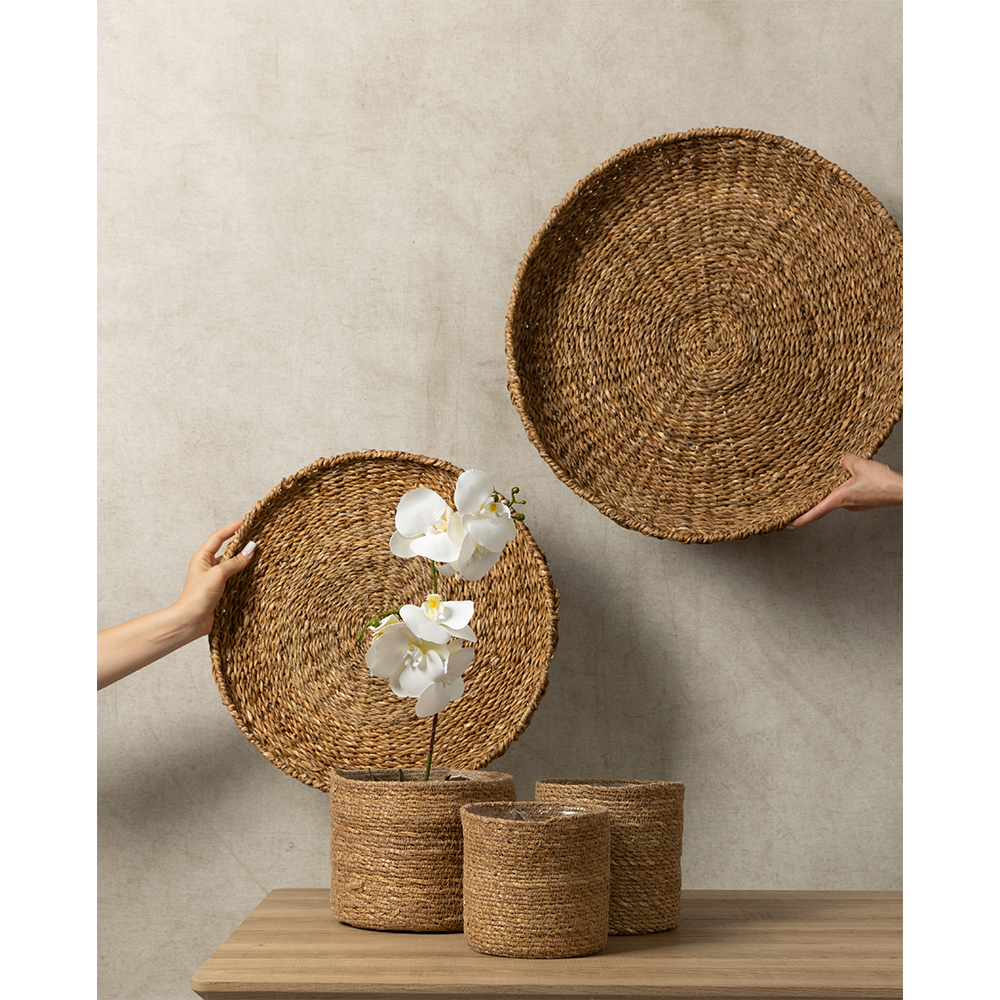 Τα κασπώ DEL MAR σετ 3τμχ σε φυσική απόχρωση προσφέρουν έναν κομψό και οργανικό τρόπο ανάδειξης φυτών και διακόσμησης. Κατασκευασμένα από ανθεκτικό seagrass, διαθέτουν στιβαρή δομή και εξαιρετική αντοχή στην καθημερινή χρήση. Η φυσική τους υφή φέρνει ζεστασιά και boho χαρακτήρα σε σαλόνια, μπαλκόνια ή εισόδους. Το σετ τριών μεγεθών επιτρέπει ευέλικτη τοποθέτηση και συνδυασμούς. Ιδανικά για όσους επιθυμούν διακόσμηση με φυσικό, γήινο ύφος.
