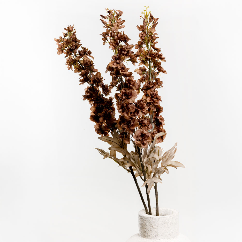 Το καφέ τεχνητό λουλούδι DELPHINIUM 108cm αποπνέει διακριτική κομψότητα και γήινη αρμονία, ιδανικό για φυσικές και minimal διακοσμητικές συνθέσεις. Ταιριάζει εξαιρετικά με ξύλινες λεπτομέρειες και ουδέτερους τόνους, δίνοντας μια αίσθηση ηρεμίας στον χώρο. Η υφή του πολυεστέρα προσδίδει ρεαλισμό στα πέταλα, τραβώντας τα βλέμματα. Μια εξαιρετική επιλογή για οικιακή ή επαγγελματική διακόσμηση που ενισχύει τη θαλπωρή και την ισορροπία του χώρου.