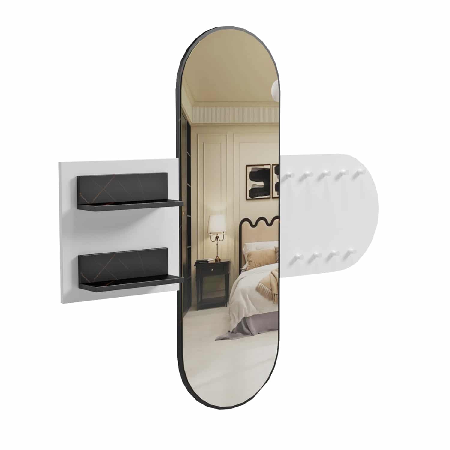 Η κρεμάστρα εισόδου με καθρέφτη CHERYL διαθέτει 9 κρεμάστρες ως βεστιάριο στην μια πλευρά του οβάλ καθρέφτη, και 2 ραφάκια σε χρώμα ΜΑΥΡΟΥ ΜΑΡΜΑΡΟΥ στην άλλη πλευρά. Όλο το έπιπλο είναι από μελαμίνη σε ΛΕΥΚΟ.