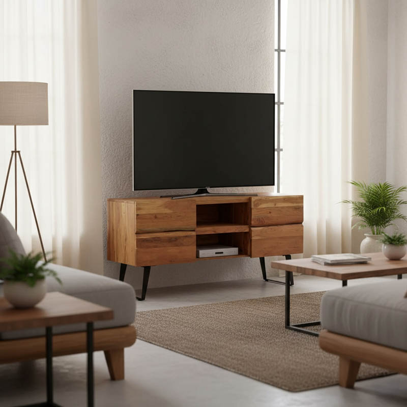 - Διαθέτει δύο ανοιχτά ράφια στο κέντρο, ιδανικά για να τοποθετήσετε τις ηλεκτρονικές σας συσκευές (DVD, κονσόλα παιχνιδιών), καθώς και δύο πλευρικά ράφια για βιβλία ή διακοσμητικά αντικείμενα.