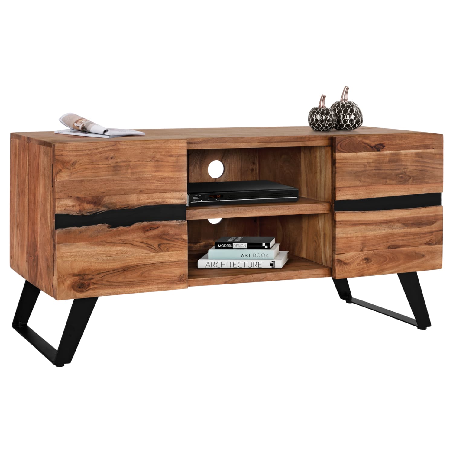Έπιπλο τηλεόρασης από μασίφ ξύλο Ακακίας σε φυσική απόχρωση και μεταλλικά πόδια σε μαύρο χρώμα.