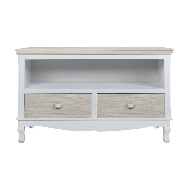 Μοντέρνο έπιπλο τηλεόρασης, σε χρώμα λευκό και γκρι. Εχει 2 συρτάρια και ένα ράφι για να τοποθετούνται ηλεκτρονικές συσκευές ή διακοσμητικά.