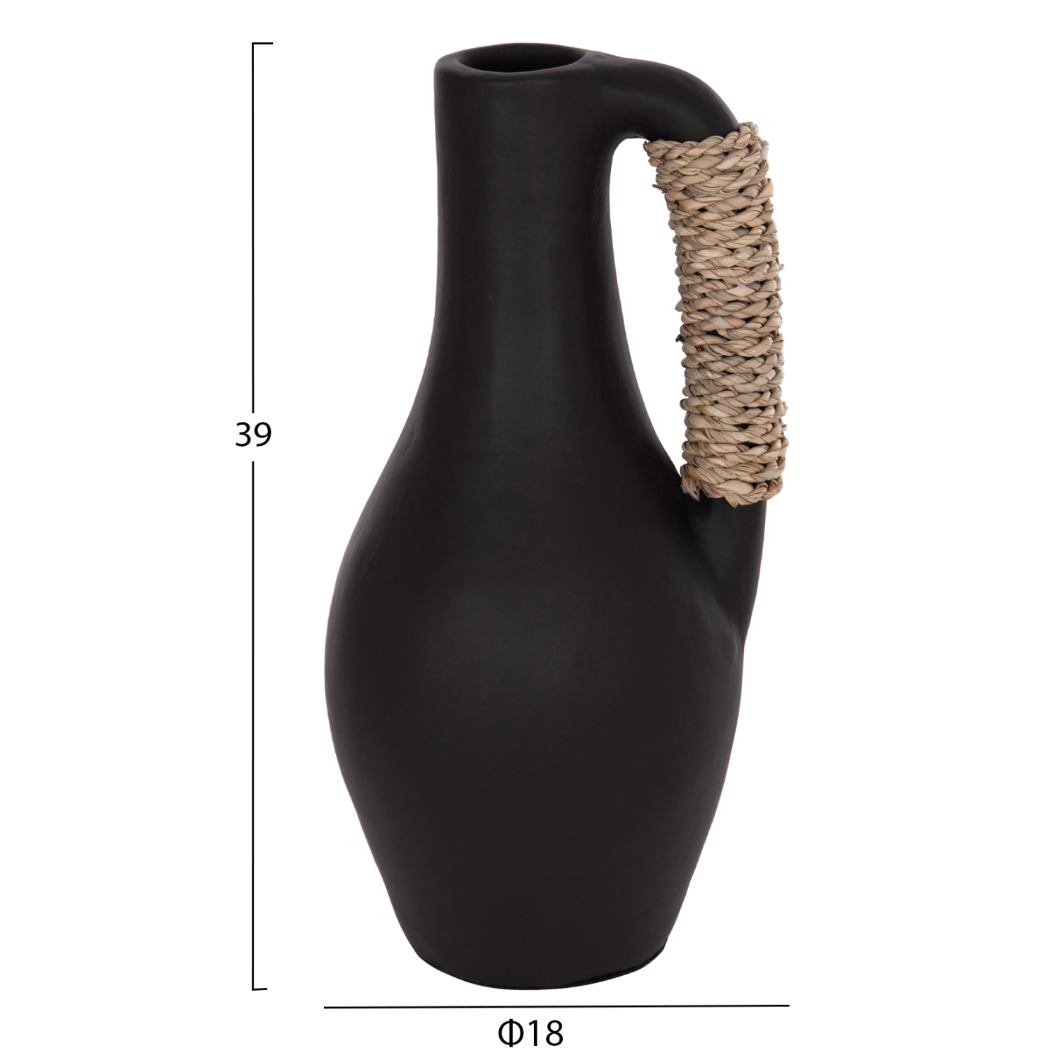 Το επιτραπέζιο χειροποίητο διακοσμητικό βάζο CAMMER είναι κατασκευασμένο εξολοκλήρου από τερακότα σε ΜΑΥΡΟ χρώμα ενώ διαθέτει διακοσμητική πλέξη από seagrass στο χερούλι που διαθέτει. Ιδανικό για πληθώρα χώρων, τόσο για το σπίτι, όσο και για επαγγελματικούς χώρους.