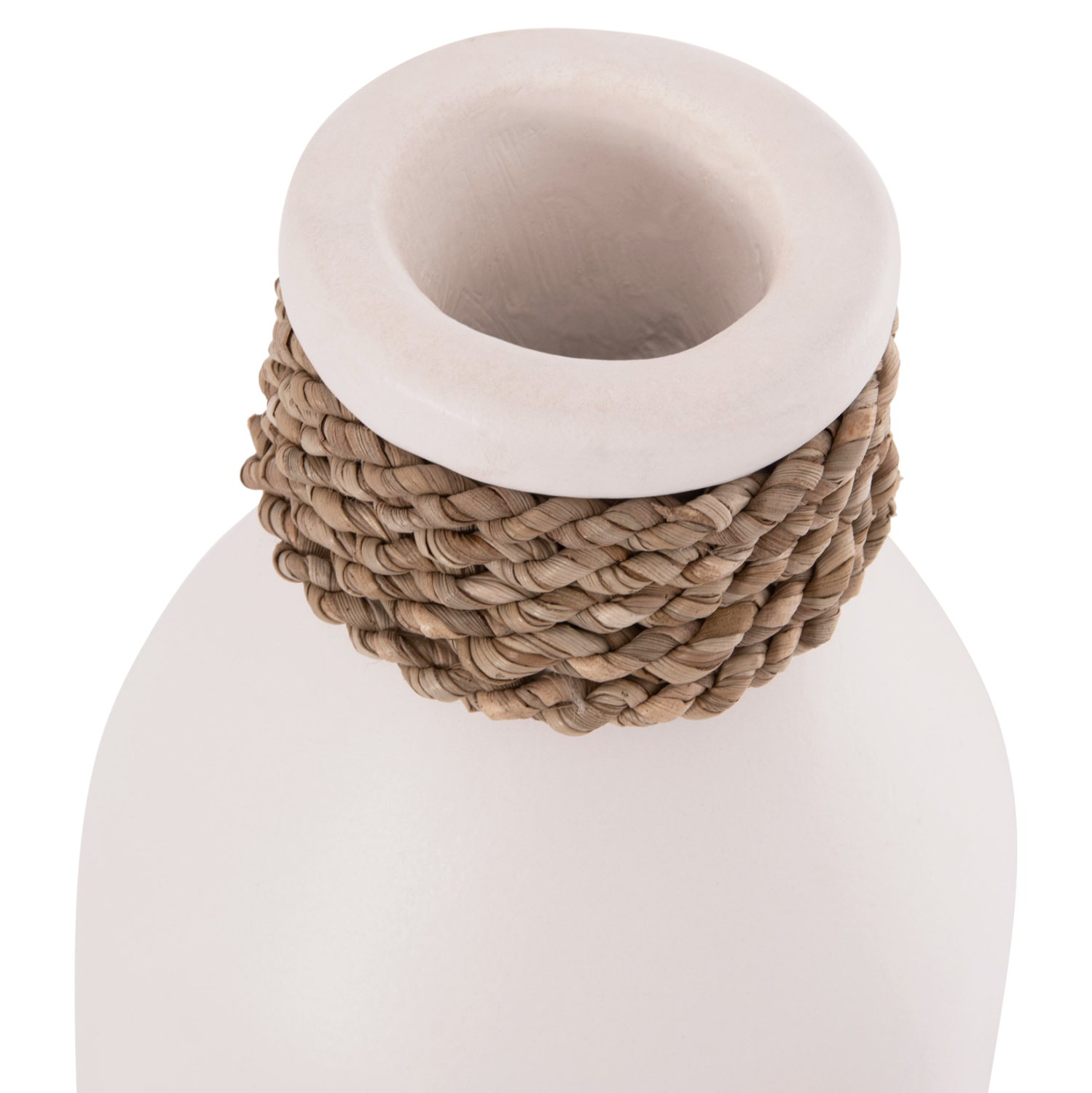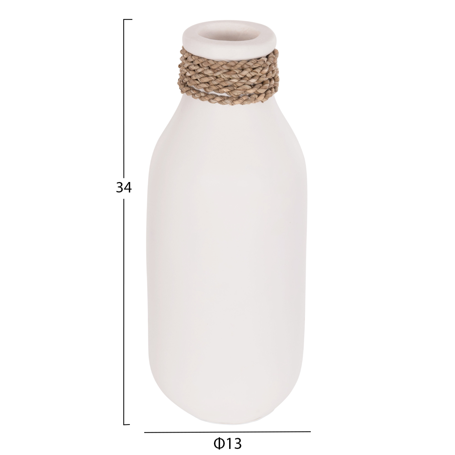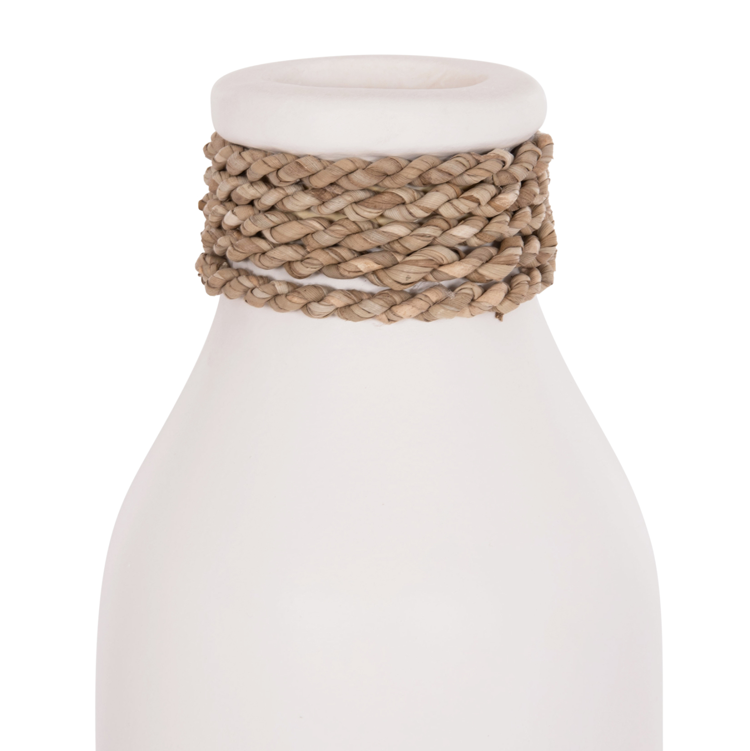 Το επιτραπέζιο χειροποίητο διακοσμητικό βάζο CAMMER έχει σχήμα μποτίλιας και είναι κατασκευασμένο εξολοκλήρου από τερακότα σε ΛΕΥΚΟ χρώμα ενώ διαθέτει διακοσμητική πλέξη από seagrass στον «λαιμό» ακριβώς κάτω από το στόμιο. Ιδανικό για πληθώρα χώρων, τόσο για το σπίτι, όσο και για επαγγελματικούς χώρους.
