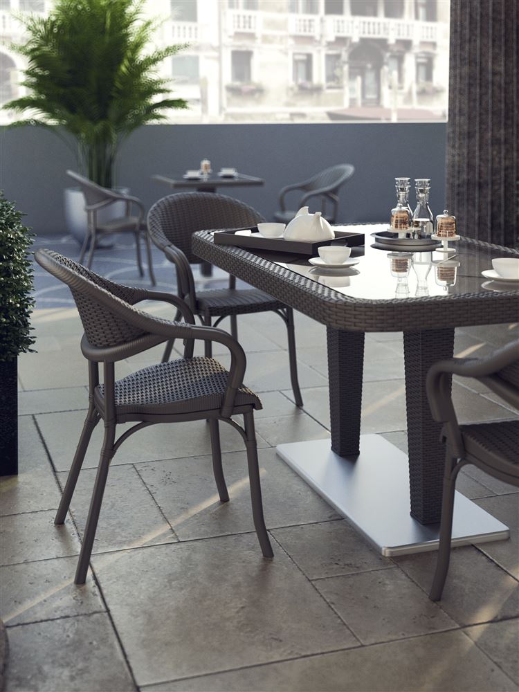 Το υλικό της πλάτης και των πλαϊνών έχει υφή rattan, η οποία καμουφλάρει τις μικροφθορές, ενώ ο εργονομικός σχεδιασμός προσφέρει ξεκούραστη εμπειρία καθίσματος. Παρέχεται και δυνατότητα προσθήκης μαξιλαριού, για ακόμα πιο αναπαυτικό κάθισμα.