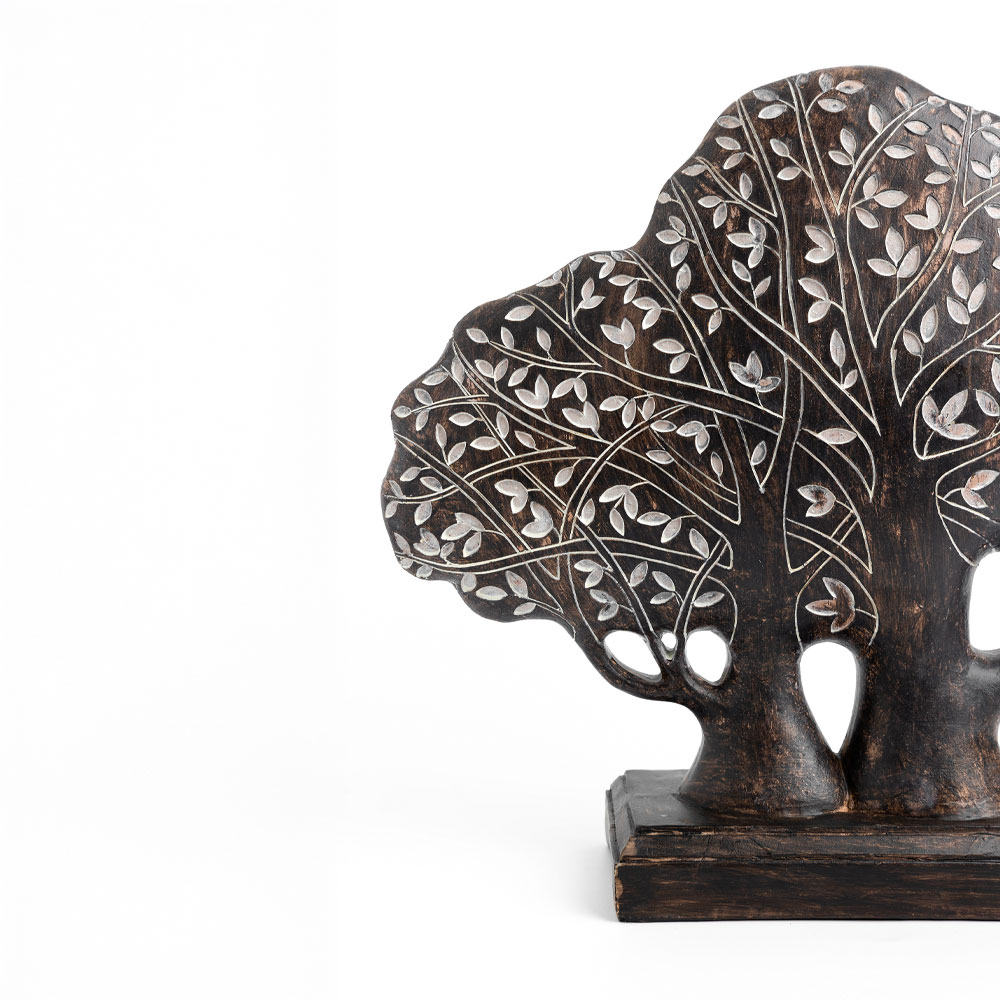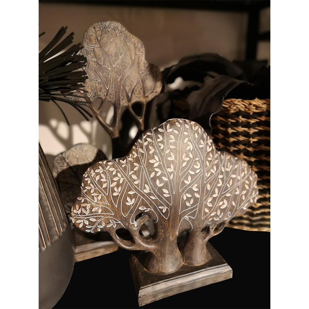 Το FORET 3 αποτυπώνει με καλλιτεχνική λεπτότητα τη δύναμη της φύσης μέσα από δύο δέντρα με ενιαία κόμη. Με ανάγλυφα φύλλα σε λευκή απόχρωση και καμπύλες γραμμές, δημιουργεί μια αίσθηση αρμονίας και ισορροπίας. Το σκούρο καφέ φινίρισμα σε συνδυασμό με τη φυσική υφή της πολυρεσίνης το καθιστούν ιδανικό για χώρους με ethnic, rustic ή nature-inspired αισθητική. Τοποθετήστε το σε ράφια, μπουφέδες ή εισόδους για να προσθέσετε διακριτική κομψότητα και γαλήνη στον χώρο.