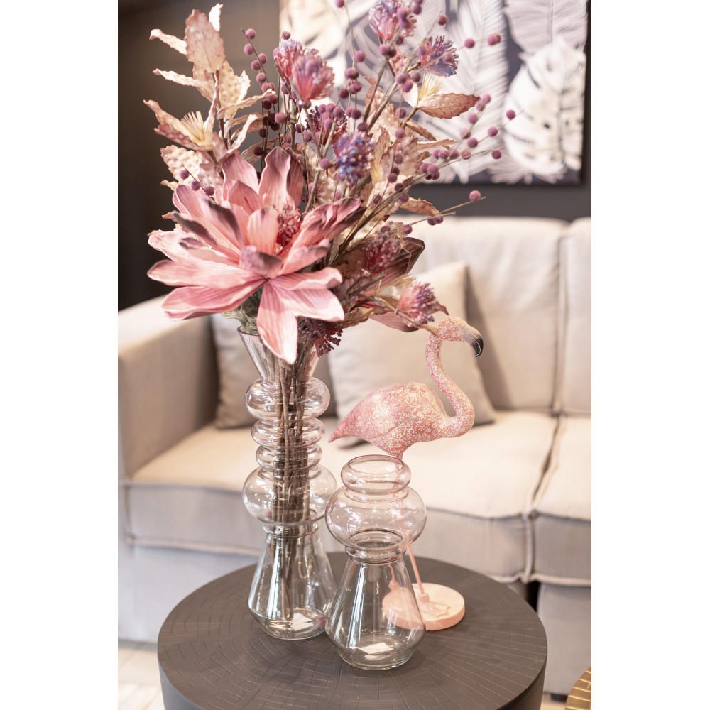 Το βάζο FORME από γυαλί σε διχρωμία ροζ και πράσινου ξεχωρίζει για τον τολμηρό και καλλιτεχνικό σχεδιασμό του. Η ψηλή και γλυπτική του φόρμα, με εναλλαγή γεωμετρικών σχημάτων, το καθιστά statement διακοσμητικό στοιχείο για μοντέρνους και εκλεκτικούς χώρους. Ιδανικό για τοποθέτηση σε κονσόλες ή δάπεδο με μακριά τεχνητά άνθη.
