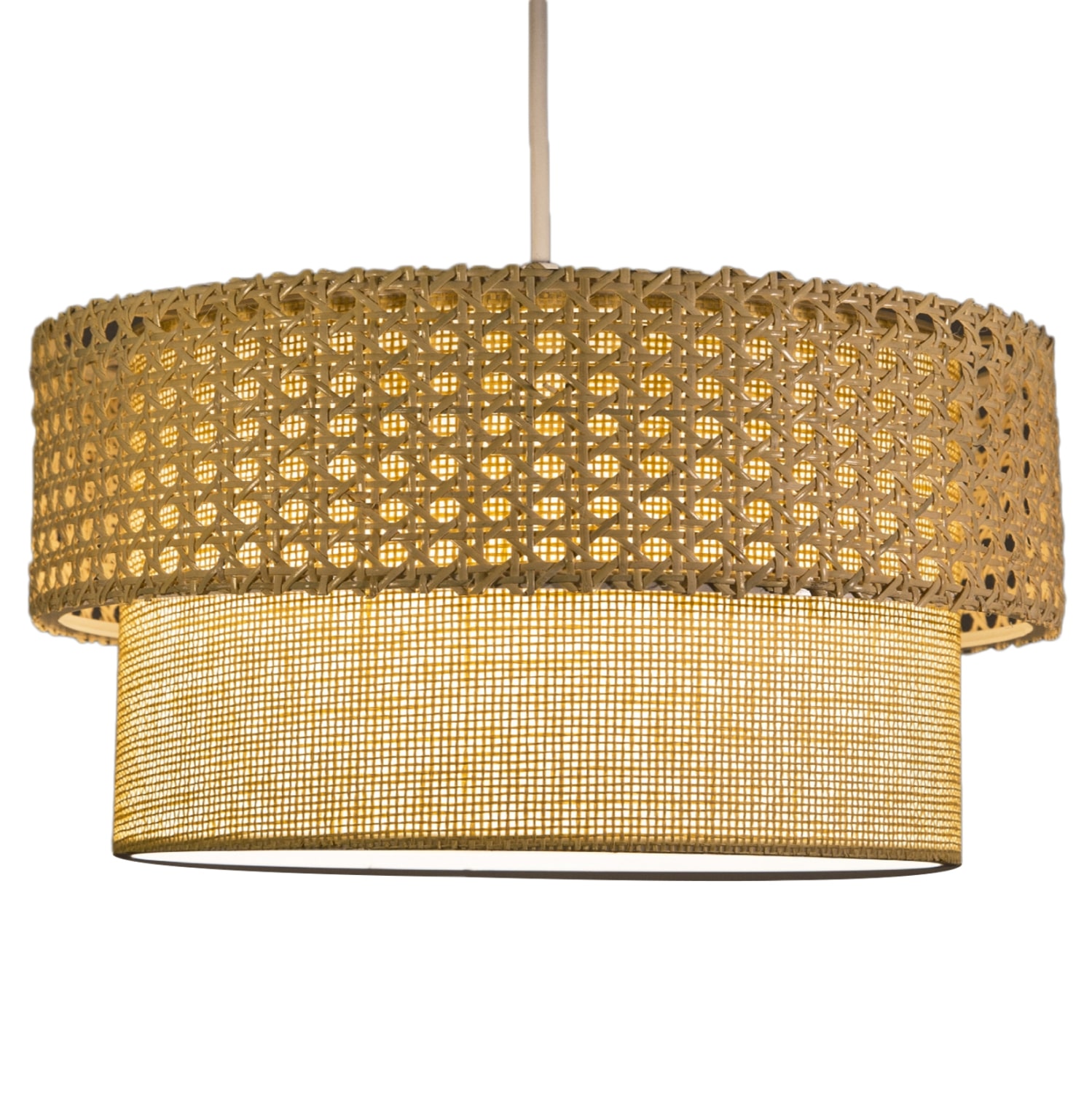 Η υφή του υφάσματος και η πλέξη rattan από πάνω, μπορεί να είναι λίγο ασυνήθιστη για κρεμαστό φωτιστικό, αλλά χάρη στο ανοιχτό χρώμα των τυμπάνων, δίνει στο φως μια απαλή λάμψη.