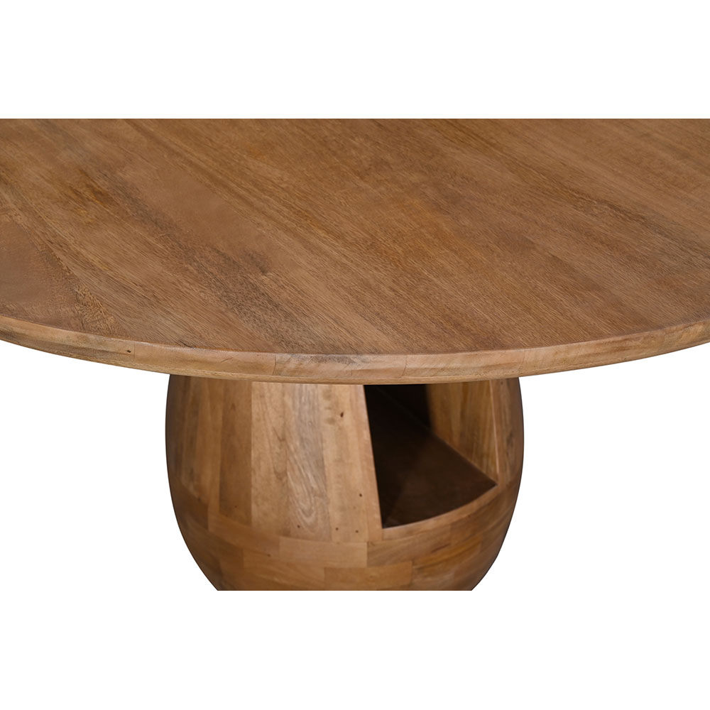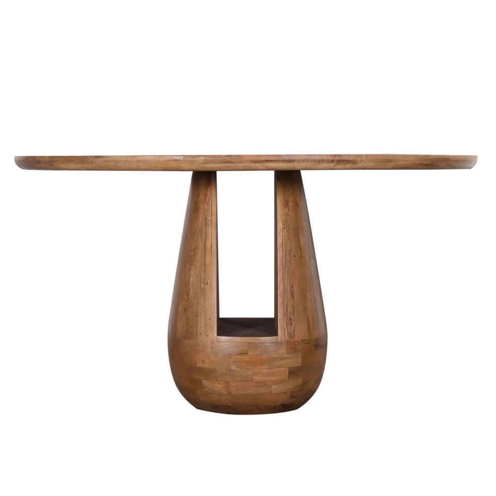 Το τραπέζι GATE αποτελεί ένα statement κομμάτι με γλυπτική αισθητική και έντονη φυσική υφή. Η στρογγυλή του επιφάνεια διαμέτρου 140 cm και η οργανική βάση τύπου σταγόνας είναι κατασκευασμένες από ξύλο mango σε φυσική απόχρωση, αναδεικνύοντας την αυθεντικότητα του υλικού. Ένα εντυπωσιακό τραπέζι φαγητού που ενώνει τη φυσικότητα με το σύγχρονο design.