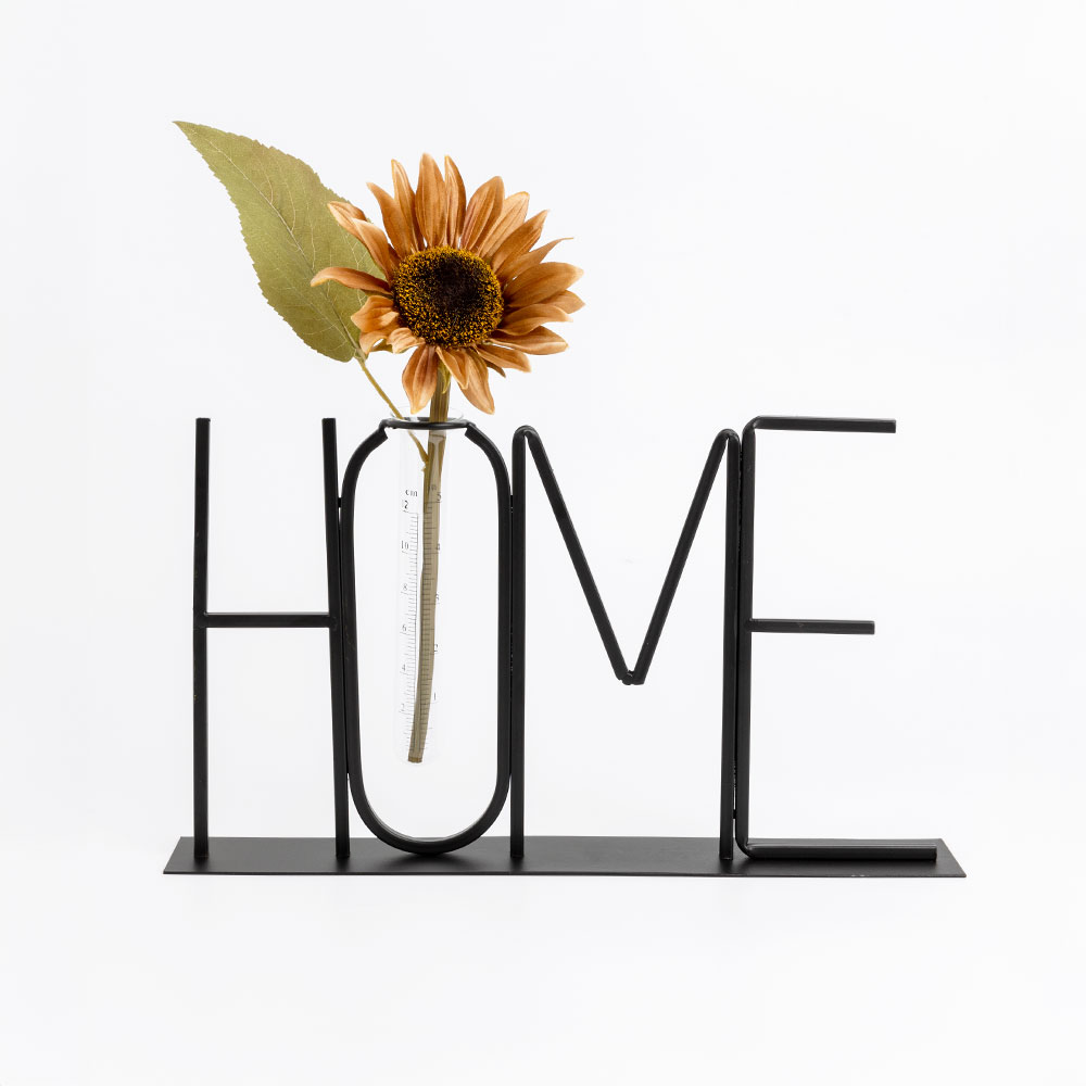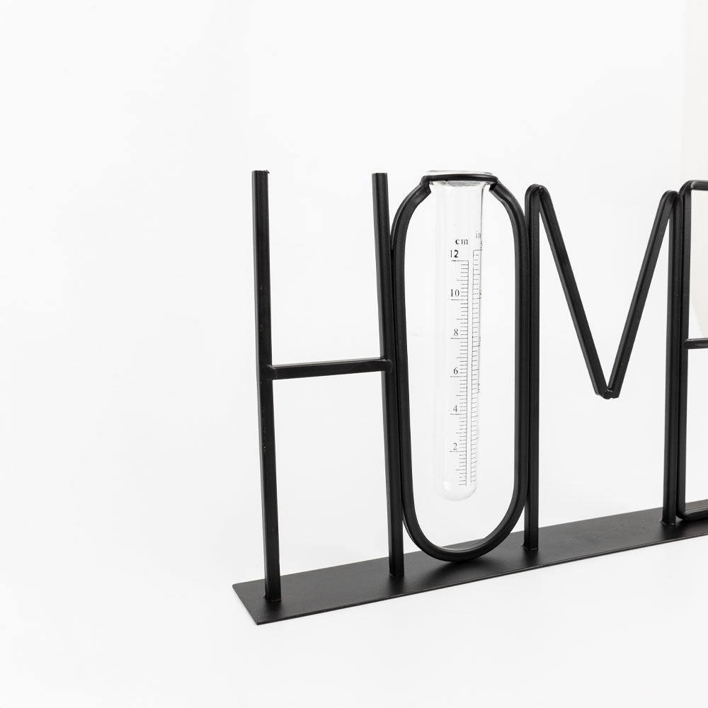 Το HOME είναι ένα μεταλλικό διακοσμητικό επιτραπέζιο στοιχείο με διαστάσεις 38x5x22cm. Περιλαμβάνει γυάλινο δοκιμαστικό σωλήνα για ένα μικρό λουλούδι ή διακοσμητικό στοιχείο. Ιδανικό για ράφι ή κονσόλα.