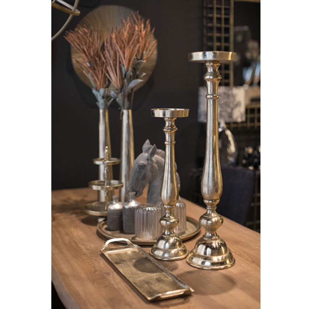Το κηροπήγιο IONAS συνδυάζει την αισθητική του κλασικού κηροπηγίου με μια refined, μοντέρνα ερμηνεία. Η χρυσή αντικέ απόχρωση προσδίδει βάθος και ζεστασιά στο design, ενώ το ύψος των 55 cm το καθιστά ιδανικό για layering σε τραπέζια, μπουφέδες ή διακοσμητικές συνθέσεις. Η ανθεκτική κατασκευή από αλουμίνιο εξασφαλίζει διάρκεια, ευχρηστία και σταθερότητα.