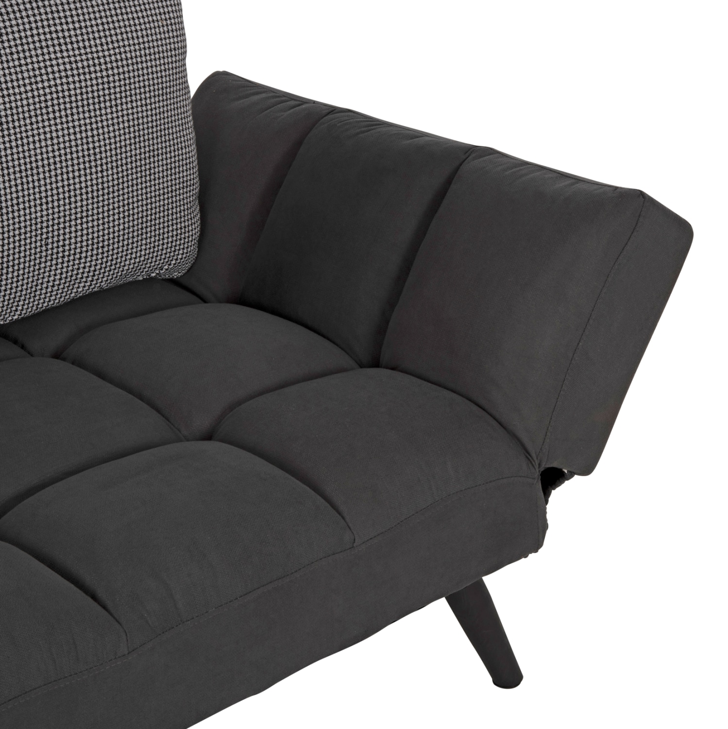 Μοντέρνος καναπές κρεβάτι πολυμορφικός με αναδιπλούμενα μπράτσα, μαξιλάρια και επένδυση από ΓΚΡΙ ύφασμα.
