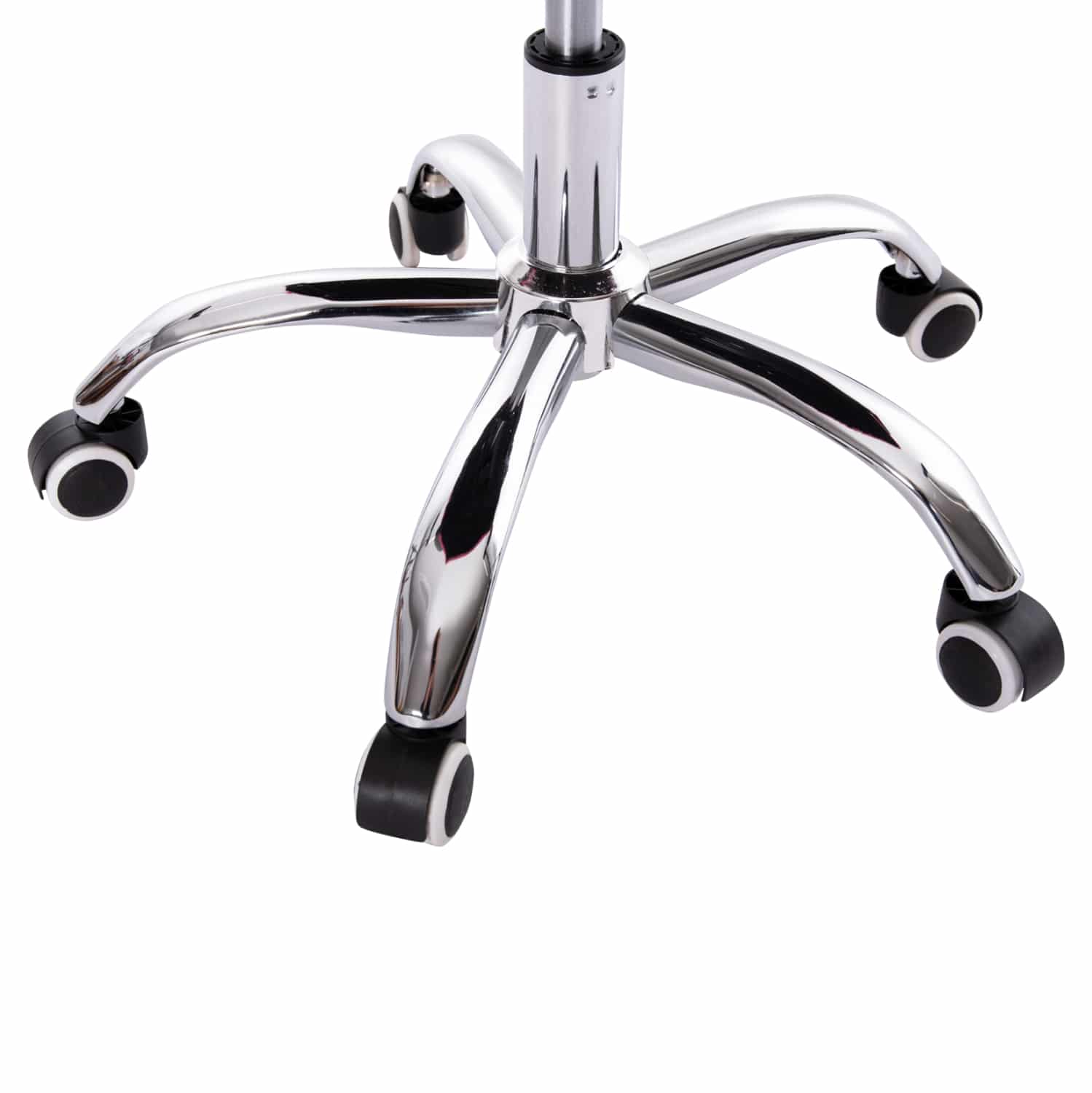 Τέλος, τα πόδια καταλήγουν στους μαύρους τροχίσκους της καρέκλας με λευκή ρίγα που είναι επίσης από ειδικό nylon υλικό και επιφάνεια κύλισης από μαλακή πολυουρεθάνη για αθόρυβη κύλιση και ταυτόχρονα προστασία του πατώματος.