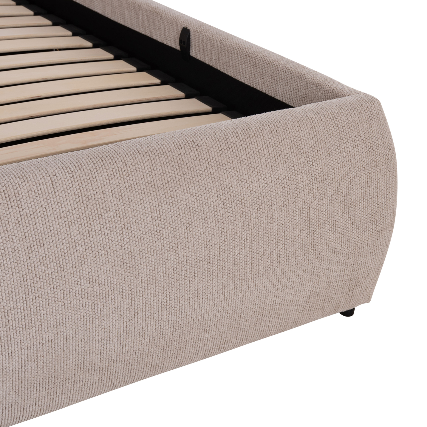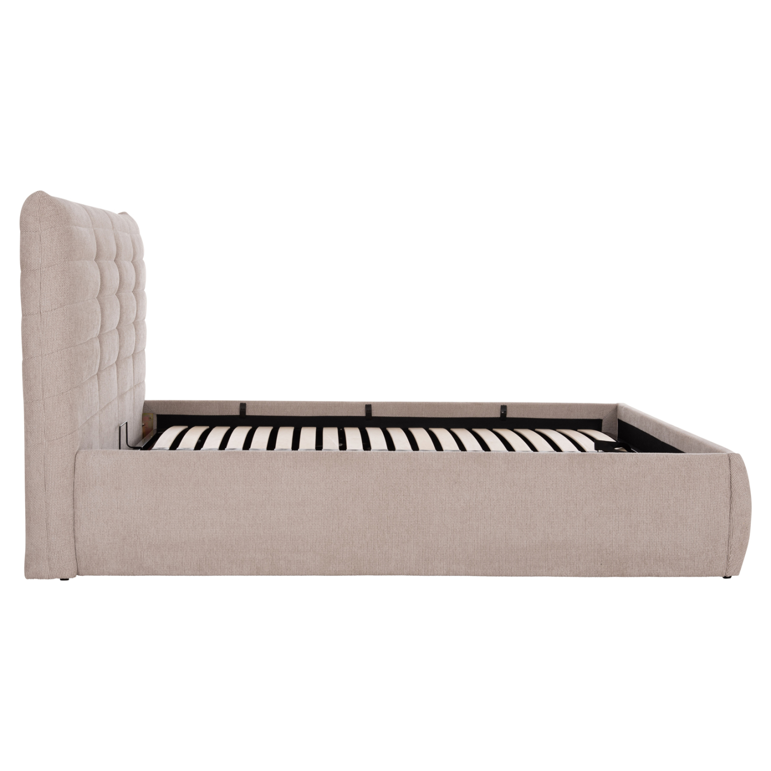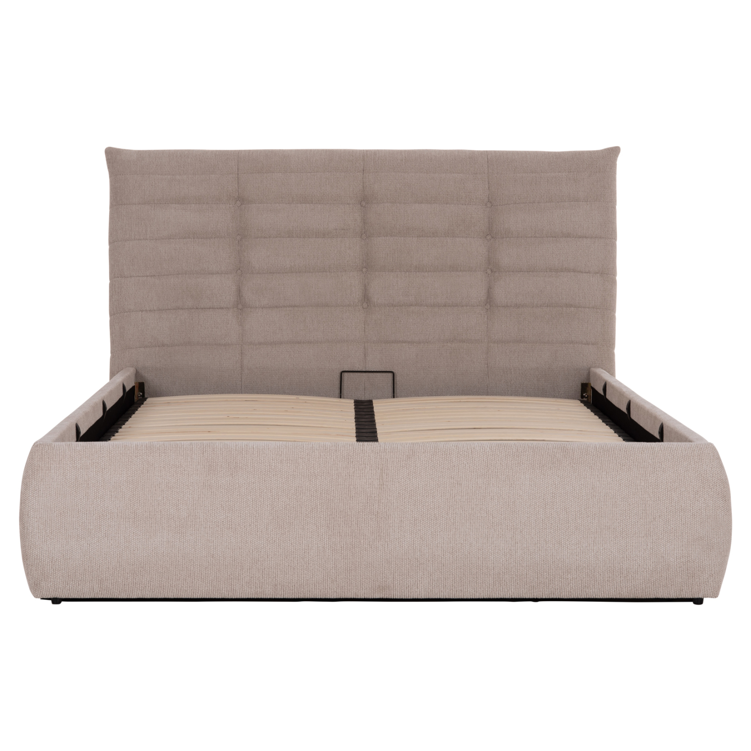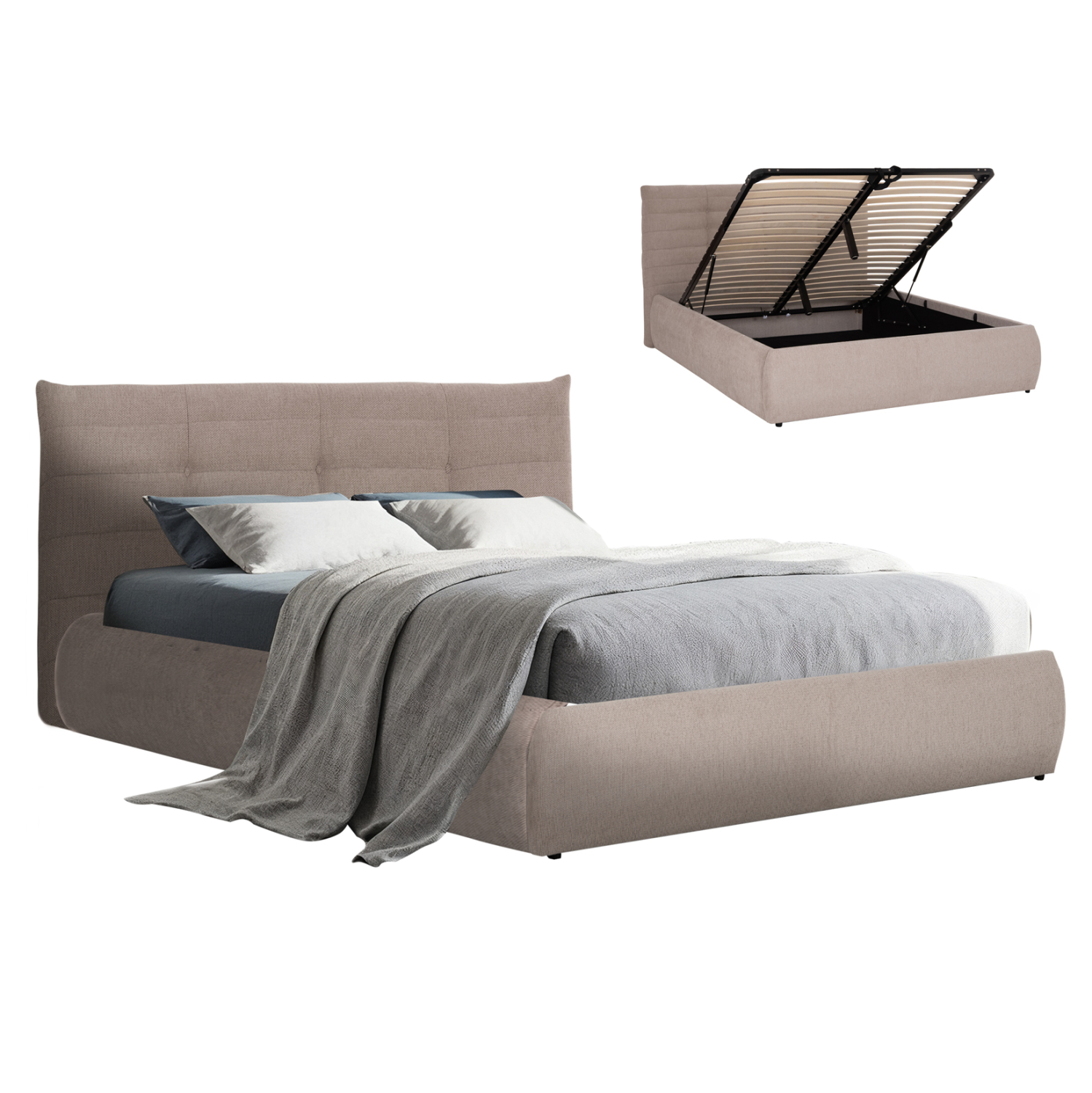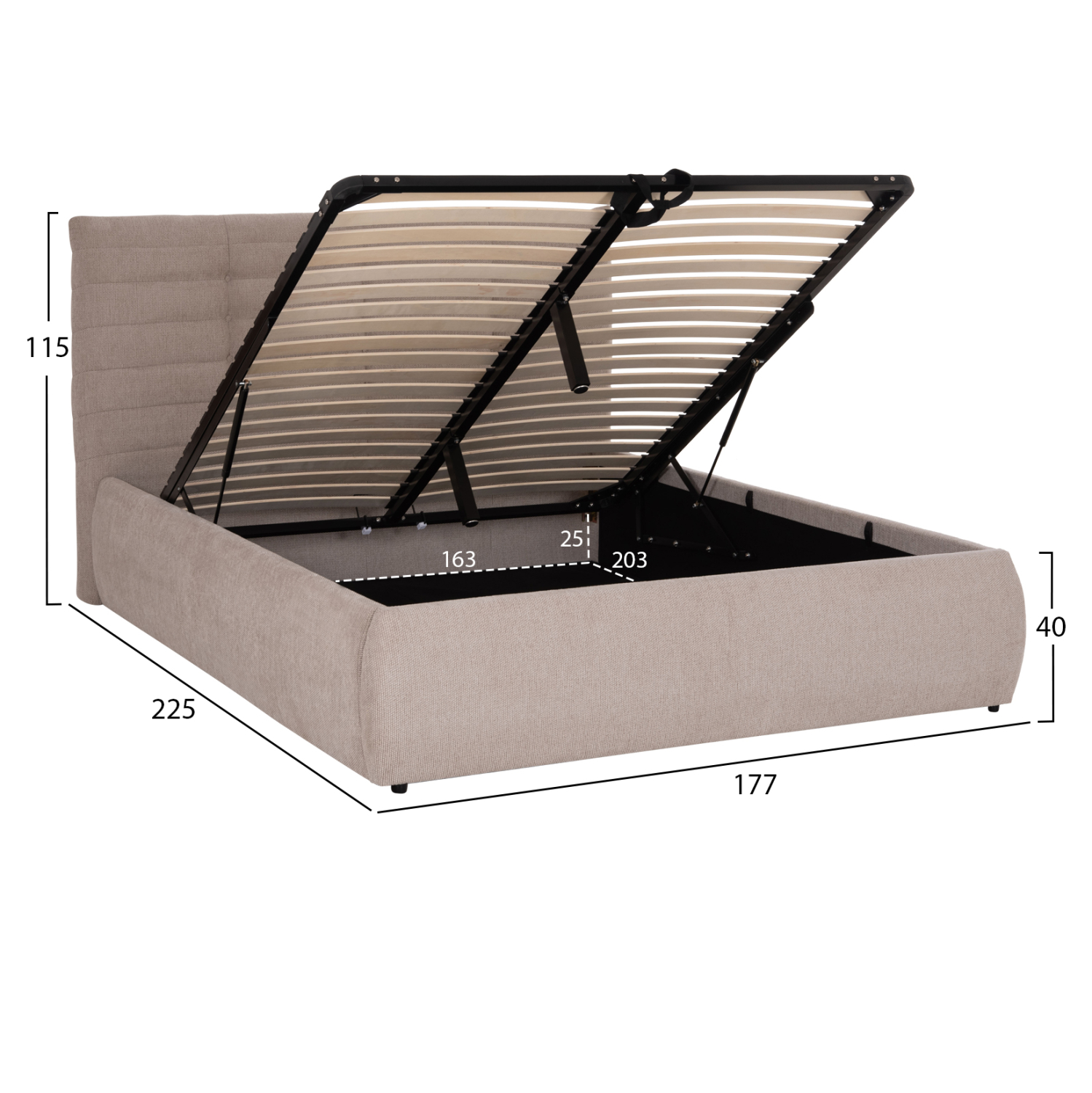 Το στρώμα στηρίζεται σε 20 σειρές εργονομικές τάβλες στήριξης, οι οποίες τοποθετούνται σε ένα μεταλλικό πλαίσιο που ανασηκώνεται με μηχανισμό ασφαλείας, προσφέροντας έναν μεγάλο αποθηκευτικό χώρο επενδυμένο επίσης με ύφασμα. Μια μοντέρνα πρόταση που θα ανανεώσει το υπνοδωμάτιό σας.