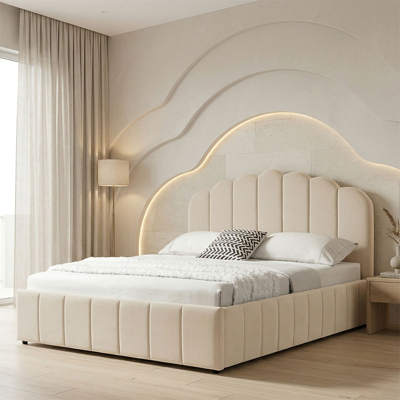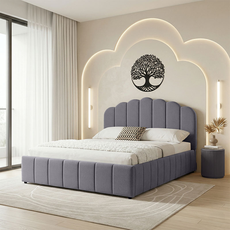 Αναβαθμίστε την κρεβατοκάμαρά σας με αυτό το εντυπωσιακό κρεβάτι, που συνδυάζει την υψηλή αισθητική με την πρακτική αποθήκευση. Το κυρίαρχο στυλ χαρακτηρίζεται από ανάγλυφα, καμπυλωτά τμήματα προσδίδοντας μια bohemian πολυτέλεια και μια αίσθηση απαλότητας στον χώρο.