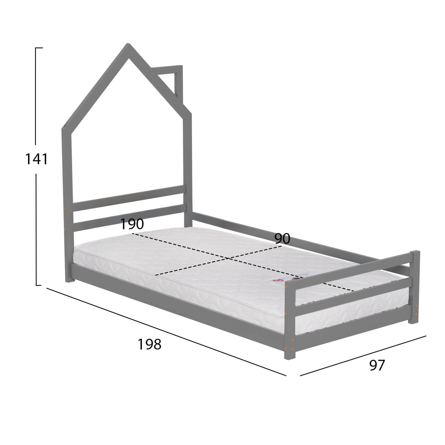 Το παιδικό κρεβάτι HOUSER τύπου Montessori σε διάσταση για στρώμα 90×190εκ, είναι κατασκευασμένο από ξύλο πεύκου σε ΓΚΡΙ χρώμα. Tο κεφαλάρι έχει σχήμα σπιτιού με καμινάδα και τα πόδια είναι εξαιρετικά χαμηλά, ενώ το στρώμα τοποθετείται σε τάβλες από κόντρα-πλακέ ξυλεία.