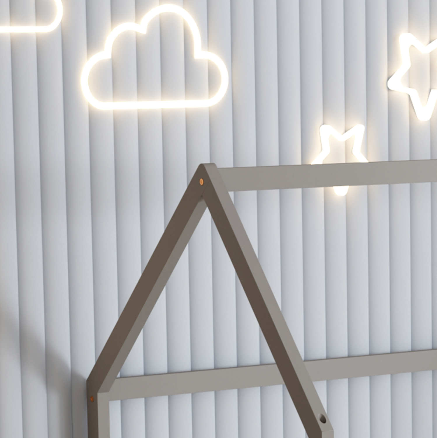 Το παιδικό κρεβάτι PHYLLIS τύπου Montessori σε διάσταση για στρώμα 90×190εκ, είναι κατασκευασμένο από ξύλο πεύκου σε ΓΚΡΙ χρώμα. Όλο το κρεβάτι έχει σχήμα σπιτιού με εξαιρετικά χαμηλά πόδια και περιμετρικά κάγκελα, ενώ το στρώμα τοποθετείται σε τάβλες από κόντρα-πλακέ ξυλεία.