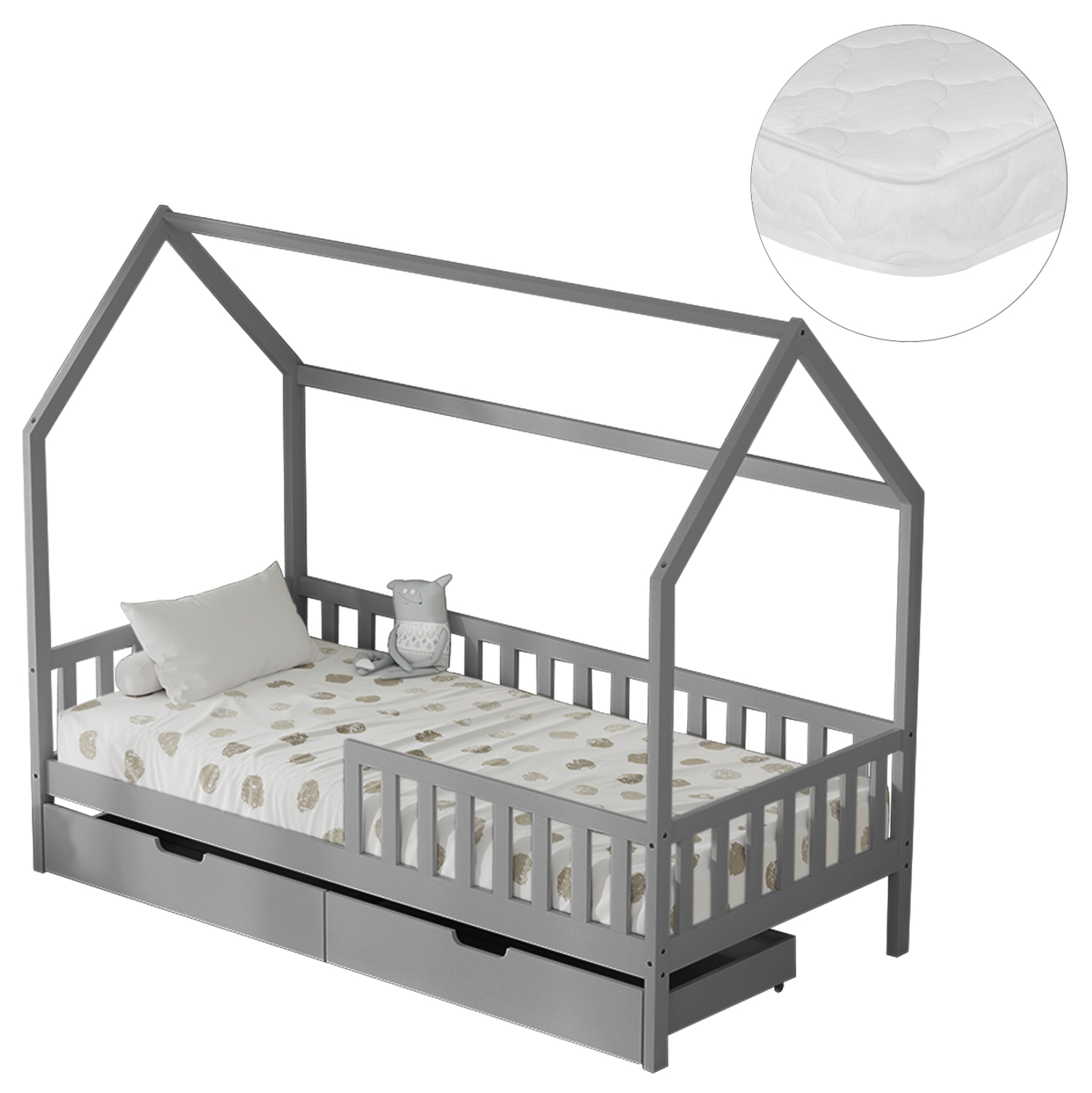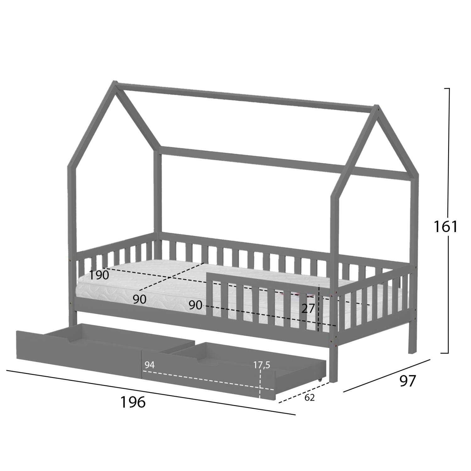 Το παιδικό κρεβάτι PHYLLIS τύπου Montessori σε διάσταση για στρώμα 90×190εκ, είναι κατασκευασμένο από ξύλο πεύκου σε ΓΚΡΙ χρώμα. Όλο το κρεβάτι έχει σχήμα σπιτιού με περιμετρικά κάγκελα και διαθέτει 2 συρτάρια στο κάτω μέρος ως αποθηκευτικό χώρο, ενώ το στρώμα τοποθετείται σε τάβλες από κόντρα-πλακέ ξυλεία.
