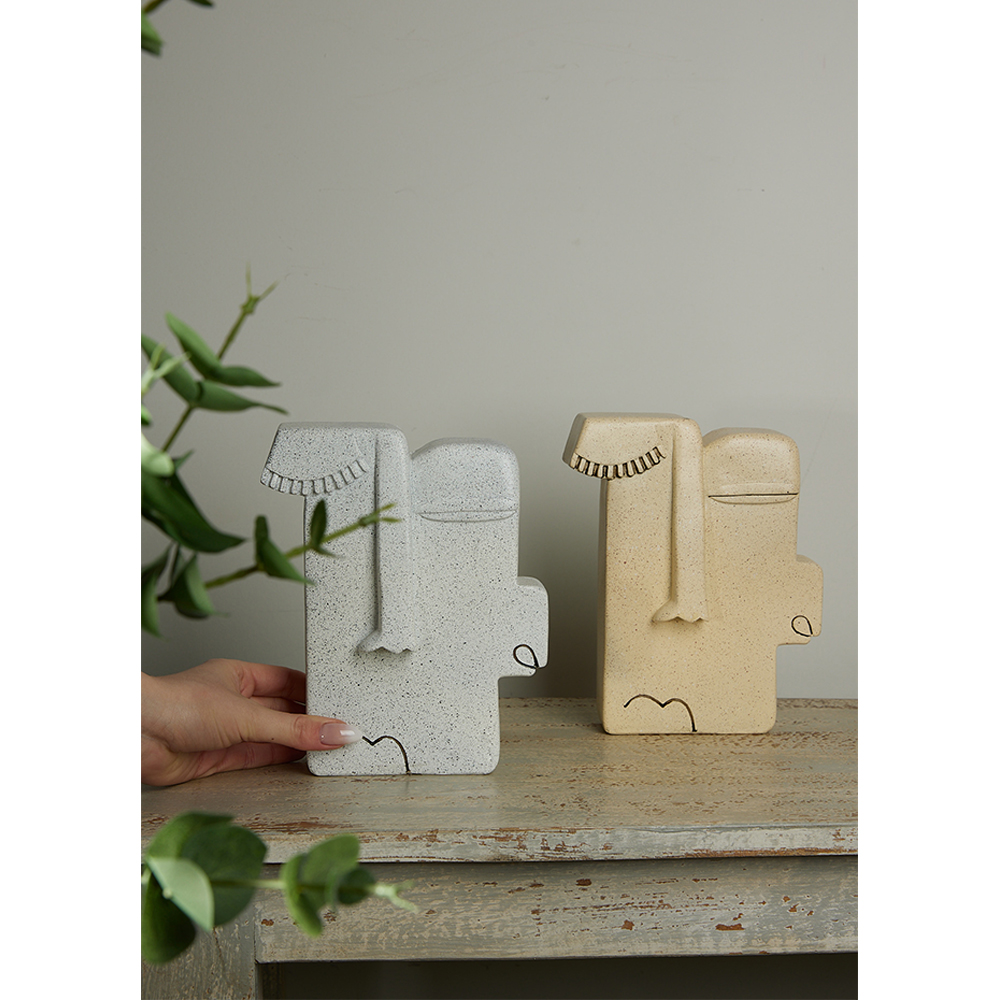 Διακοσμητικό KUVAUS 3 με αφηρημένο πρόσωπο σε γεωμετρική μορφή από polyresin, σε μπεζ χρώμα με λεπτομέρειες σε μαύρο. Μοντέρνα και καλλιτεχνική προσέγγιση με παιχνιδιάρικη διάθεση, ιδανική για contemporary, urban ή minimal χώρους. Ιδανικό για ράφια, βιβλιοθήκες ή sideboards που θέλουν να ξεχωρίσουν.