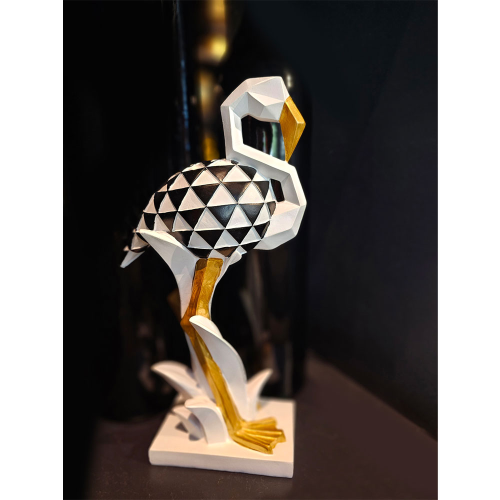 Η διακοσμητική φιγούρα LUCIEN σε σχήμα φλαμίνγκο συνδυάζει γεωμετρικό σχέδιο με καλλιτεχνική φινέτσα. Οι χρυσές λεπτομέρειες, το ασπρόμαυρο μοτίβο και η αφαιρετική γραμμή δίνουν στο αντικείμενο έναν σύγχρονο χαρακτήρα με εκλεπτυσμένο ύφος.