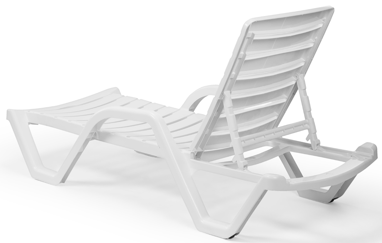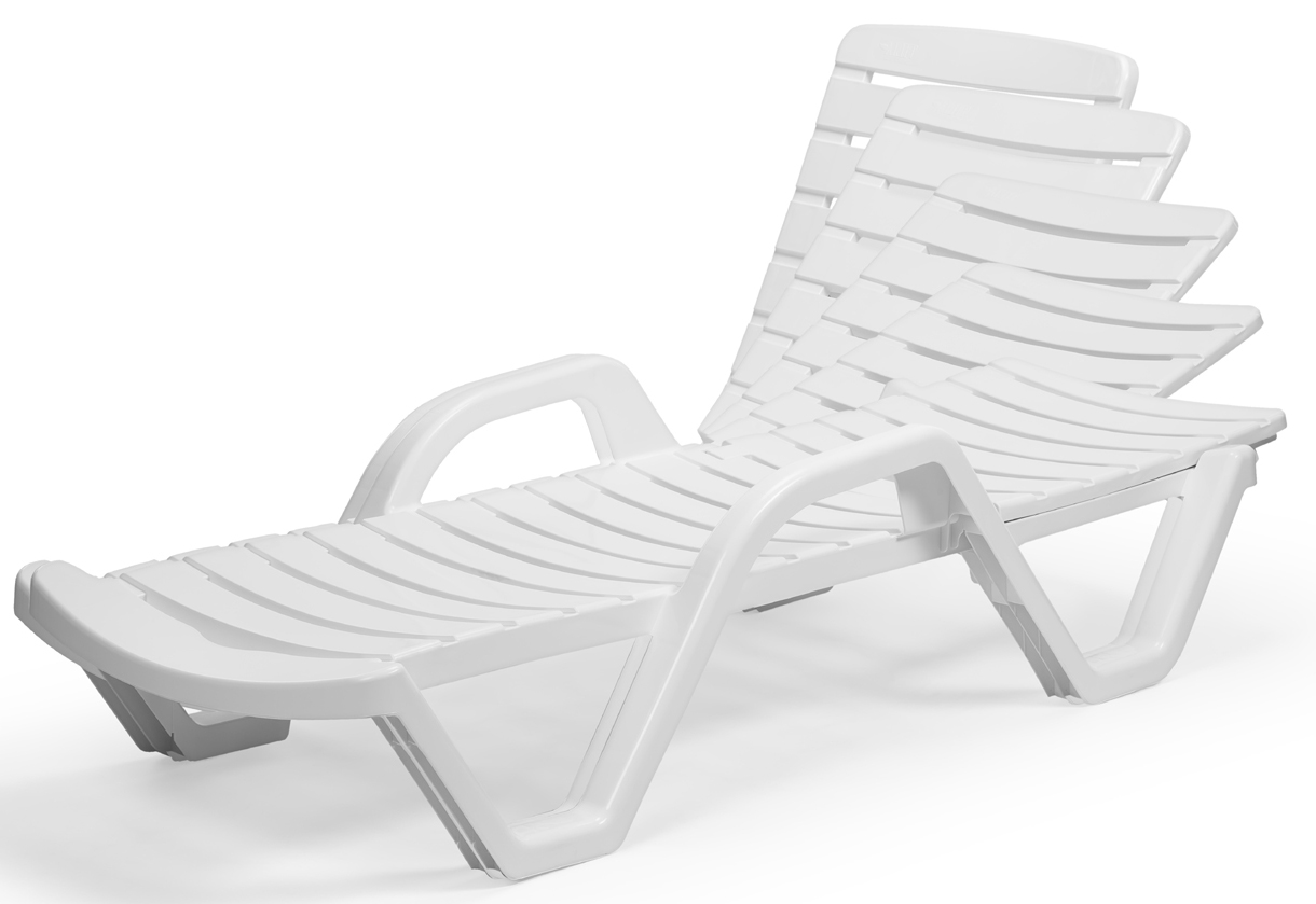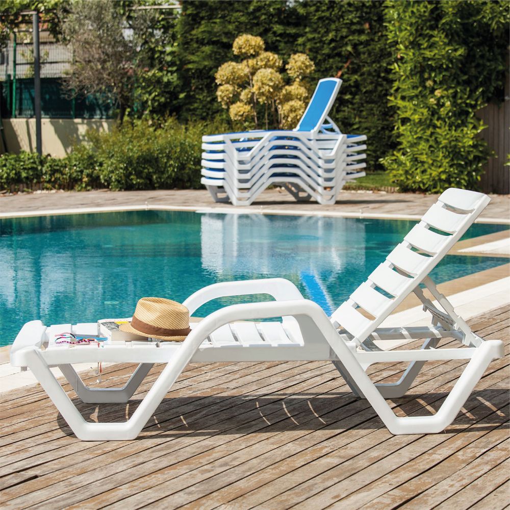 Ξαπλώστρα με μπράτσα σωληνοειδή σκελετό από πολυπροπυλένιο. Στοιβαζόμενη έως 25 τεμάχια, με ανακλινόμενη πλάτη σε 4 διαφορετικές θέσεις και αντιολισθητικά πόδια, είναι η ιδανική προσθήκη στον χώρο της πισίνας του ξενοδοχείου σας ή του beach bar σας.