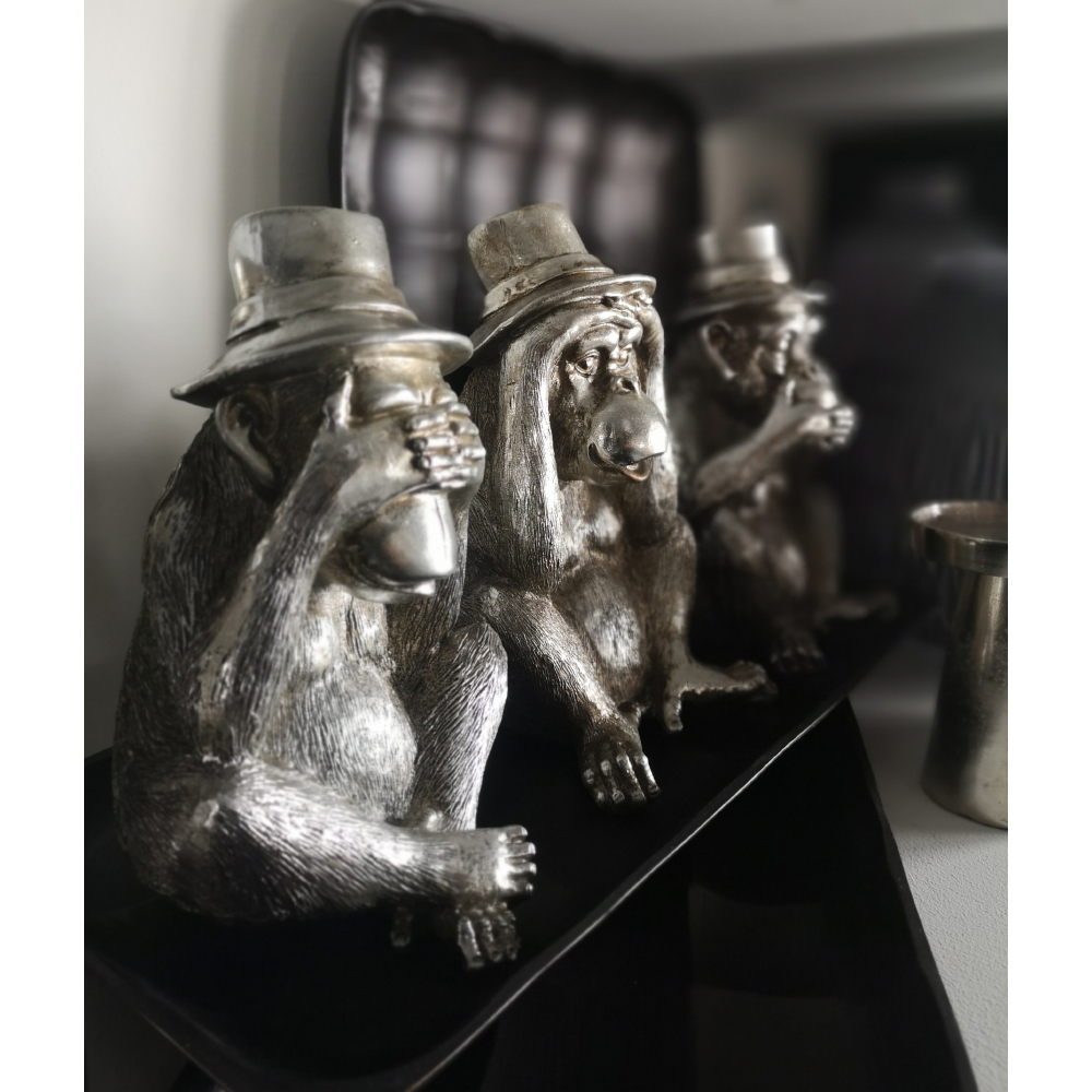 Το MONKIES διακοσμητικό σετ 3 τεμαχίων φέρνει μια παιχνιδιάρικη και ευφάνταστη διάθεση στη διακόσμηση. Οι φιγούρες των μαϊμούδων, με ασημί φινίρισμα και ιδιαίτερες λεπτομέρειες, δημιουργούν ένα ευχάριστο οπτικό αποτέλεσμα που τραβά το βλέμμα. Με διαστάσεις 14x13x22cm, το σετ ταιριάζει ιδανικά σε ράφια, κονσόλες ή γραφεία και μπορεί να τοποθετηθεί είτε ενιαία είτε χωριστά για πιο χαλαρές συνθέσεις. Κατασκευασμένο από polyresin, συνδυάζει αντοχή και χαρακτήρα.