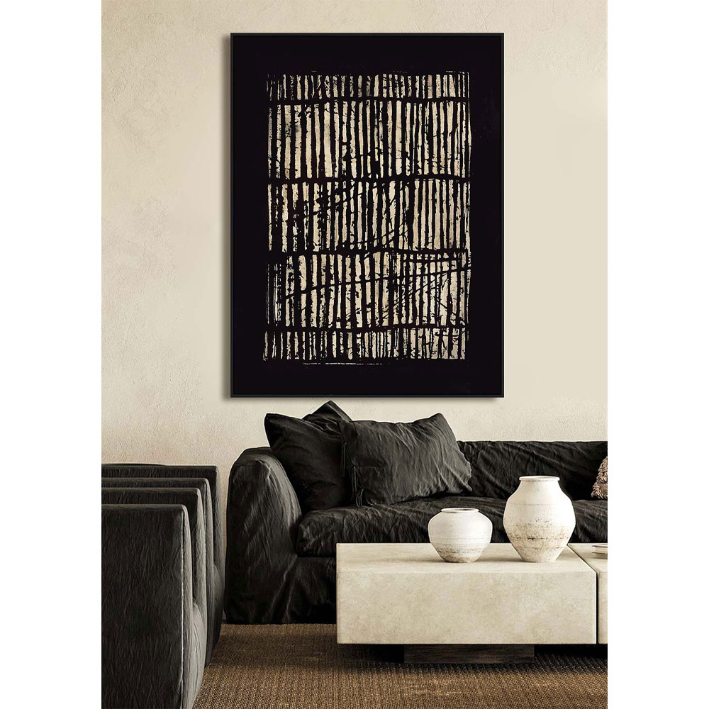 Ο πίνακας MULTIPLY παρουσιάζει ένα αφαιρετικό μοτίβο σε μαύρο φόντο, με λεπτές μπεζ πινελιές που δημιουργούν βάθος και μοντέρνα γεωμετρία. Η υψηλής ποιότητας εκτύπωση σε καμβά και η MDF κατασκευή προσφέρουν εξαιρετική ανθεκτικότητα και σταθερότητα. Η μαύρη κορνίζα ολοκληρώνει κομψά το design, καθιστώντας τον κατάλληλο για μίνιμαλ και industrial χώρους. Ένα statement κομμάτι που αποπνέει αυστηρή, καθαρή αισθητική.