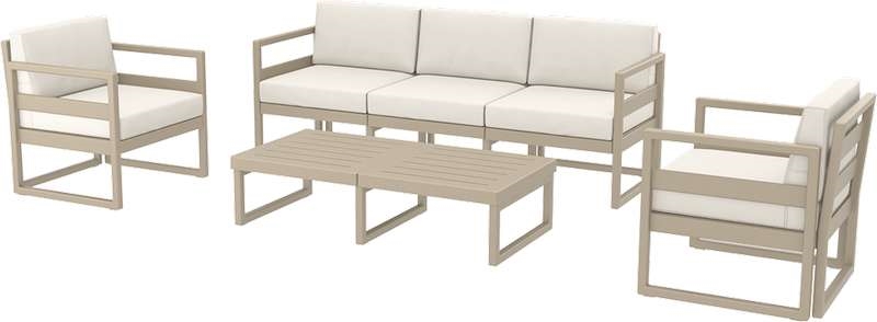 MYKONOS set του οίκου Siesta,σε χρώμα taupe.Το SET περιλαμβάνει 1 3θέσιο καναπέ,2 πολυθρόνες,τραπέζι και μαξιλάρια.Από υψηλής ποιότητας πολυπροπυλένιο με ενίσχυση από υαλώδεις ίνες (fiber glass) για απόλυτη αντοχή.Χωρίς μεταλλικό σκελετό για μεγαλύτερη αξιοπιστία στον χρόνο.Διαθέτει UV protection για μέγιστη προστασία από τον ήλιο ώστε να μην αλλοιωθούν τα χρώματα.Κατάλληλο για εσωτερική και εξωτερική χρήση.Πιστοποιημένο προϊόν από τον Ιταλικό οίκο CATAS.