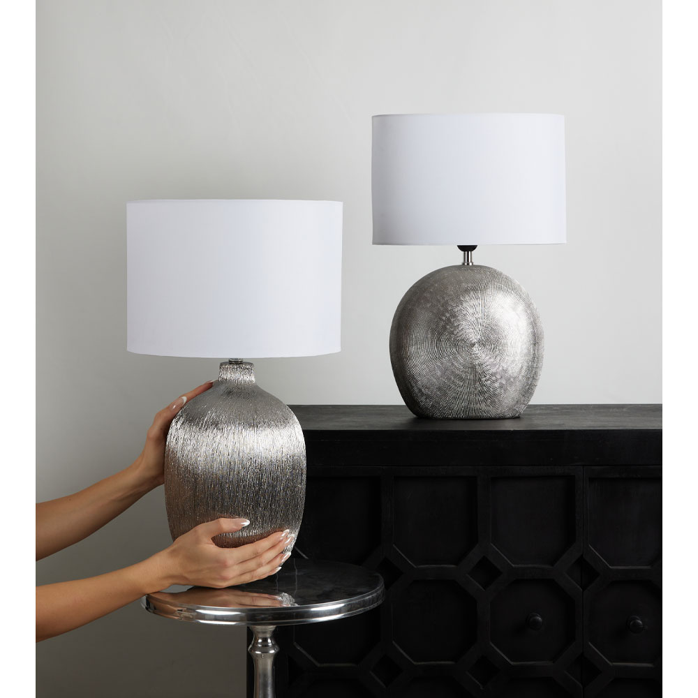 Το NEJEN είναι ένα επιτραπέζιο φωτιστικό που συνδυάζει το μοντέρνο design με διαχρονική κομψότητα. Η κεραμική του βάση σε ασημί απόχρωση προσθέτει λάμψη και στιλ, ενώ το υφασμάτινο λευκό καπέλο διαχέει το φως απαλά, δημιουργώντας μια ατμόσφαιρα ηρεμίας και θαλπωρής. Ιδανικό για κομοδίνο, βοηθητικό τραπέζι ή γραφείο.