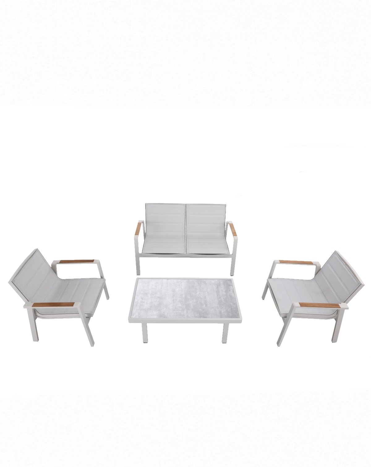 Η συλλογή Nofi 2.0 συνεχίζει τη σχεδιαστική φιλοσοφία της σειράς Nofi. Αυτή η συλλογή περιλαμβάνει έναν συνδυασμό υφασμάτων για το κάθισμα καθώς και την πλάτη και στοιχεία σε φυσικό ξύλο teak. Με επένδυση στη μέση των καρεκλών, αυτή η σειρά δεν προσφέρει λιγότερη άνεση από τα μαξιλάρια. Το Nofi-2.0-2 lounge set αλουμινίου 4-τεμαχίων αποτελείται από: 2 πολυθρόνες lounge διαστάσεων 75×73,5x77cm , 1 καναπέ lounge 2-θέσιο διαστάσεων 131,5×73,5×76,5cm και 1 κεντρικό τραπεζάκι καφέ διαστάσεων 110x65x38cm με εκτυπωμένη γυάλινη επιφάνεια. Χρώμα σκελετού: Beige no.0063. Textilene: Λευκό-Γκρι. Όλα τα ξύλινα μέρη είναι teak.