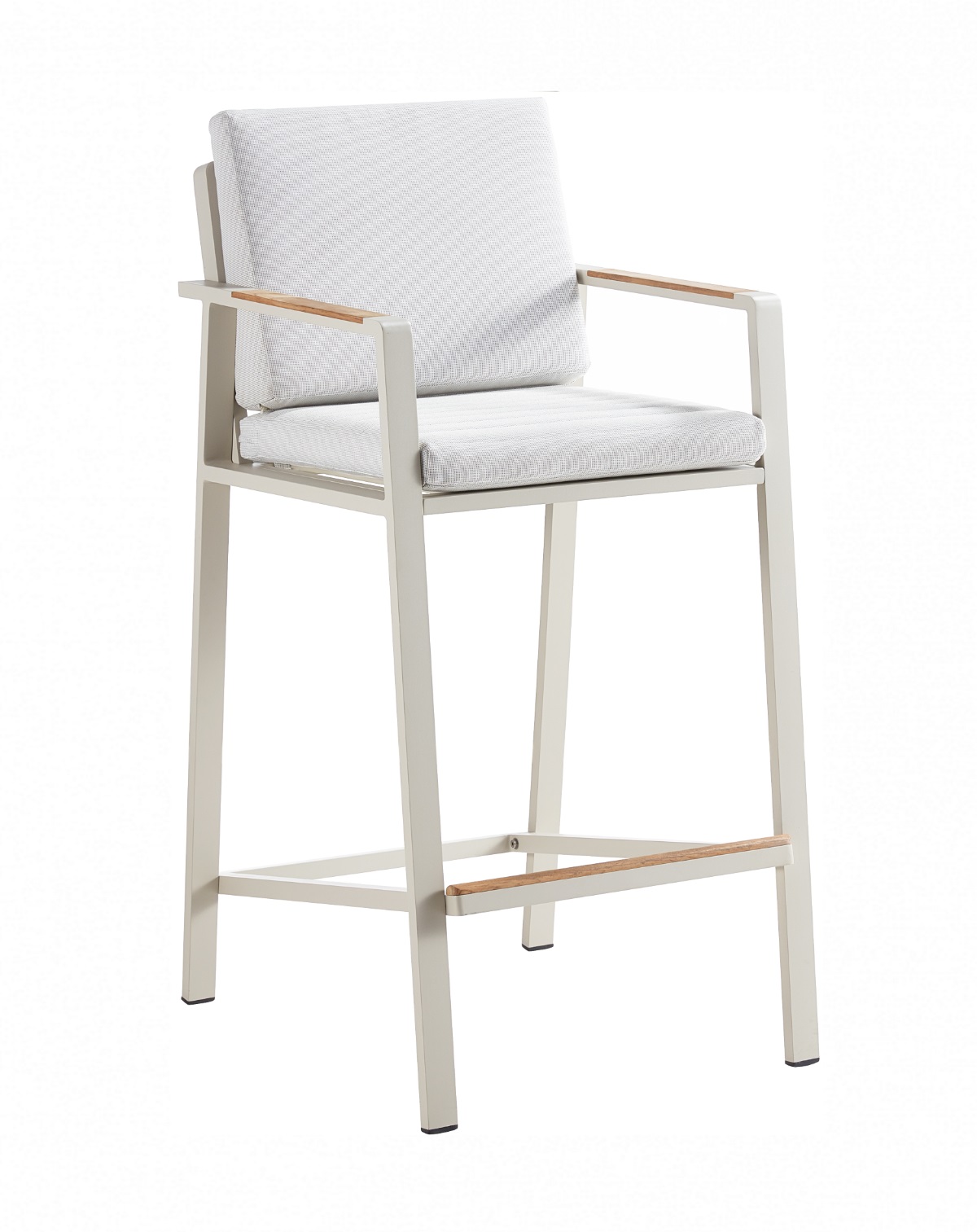 Bar Set αλουμινίου 5-τεμαχίων: 4 σκαμπό διαστάσεων 56×69,5x112cm 1 τραπέζι bar διαστάσεων 180x82x106,5cm Χρώμα σκελετού αλουμινίου: Μπεζ no. 0063 Μαξιλάρια: Λευκό-Καφέ no. FA-4077 Τα ξύλινα μέρη είναι teak.