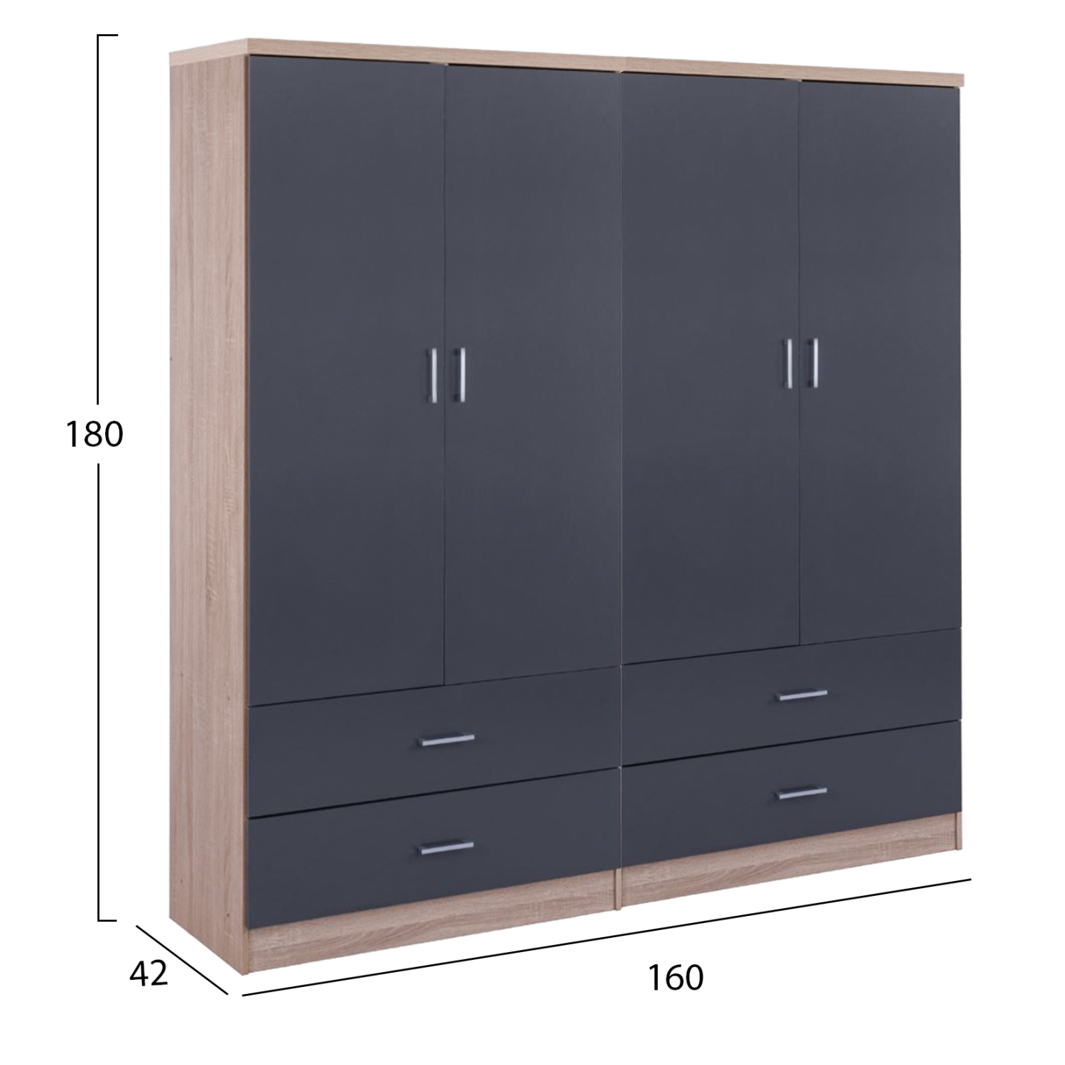 Γνωρίστε την 4-φυλλη ντουλάπα-γκαρνταρόμπα REINA. Πρόκειται για μια μεγάλη ντουλάπα με 4 πόρτες, και στο εσωτερικό της υπάρχει μόνο μια INOX μπάρα για κρέμαση ρούχων. Κάτω ακριβώς από τον χώρο της γκαρνταρόμπας υπάρχουν και 4 ευρύχωρα συρτάρια. Οι πόρτες αλλά και τα συρτάρια ανοίγουν με καλαίσθητα ασημί χερούλια. Είναι κατασκευασμένη από μελαμίνη σε ΓΚΡΙ χρώμα με SONAMA πλαίσιο, και αισθητικά μπορεί να ταιριάξει με πολλά άλλα στυλ, χάρη και στις «καθαρές» γραμμές της.