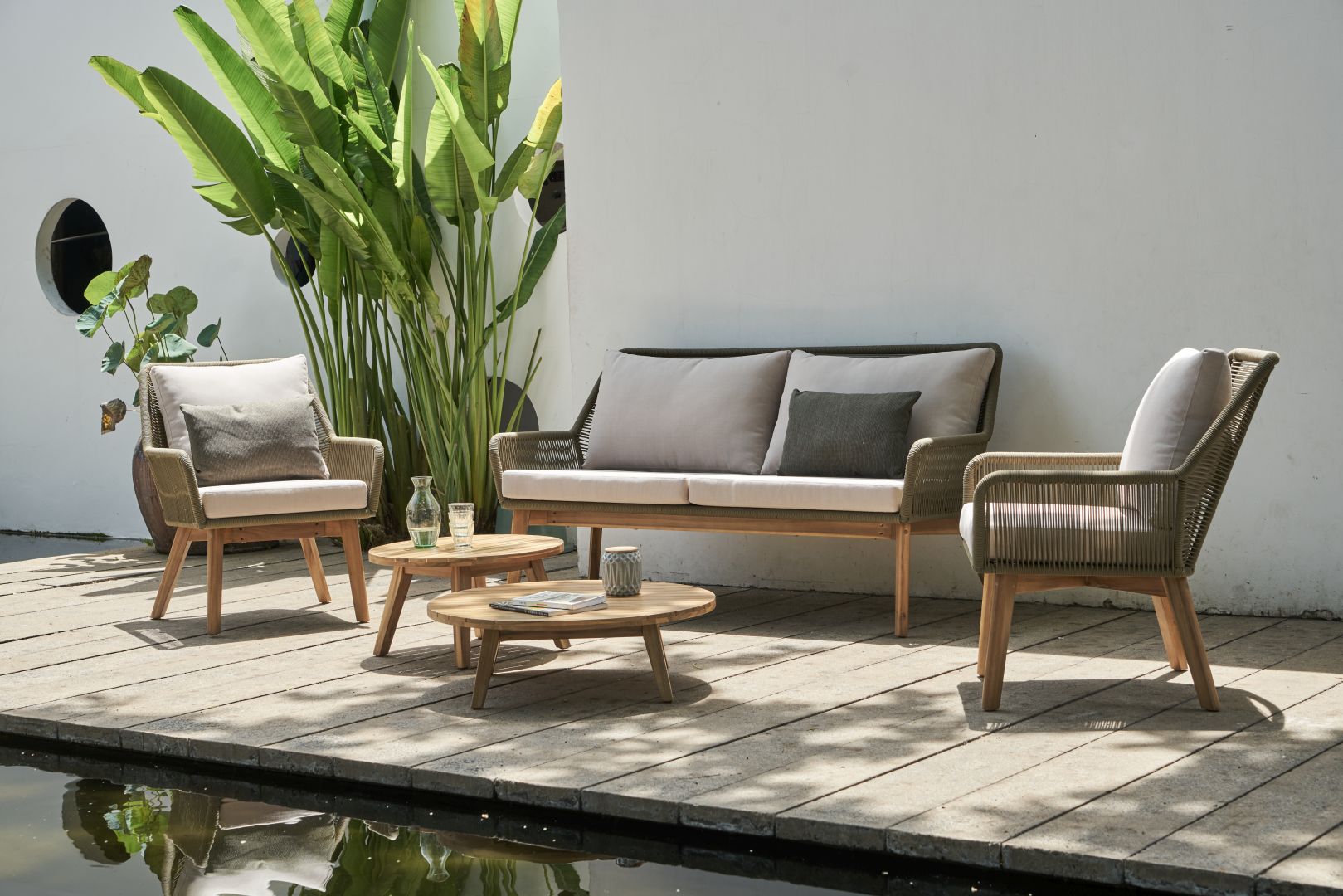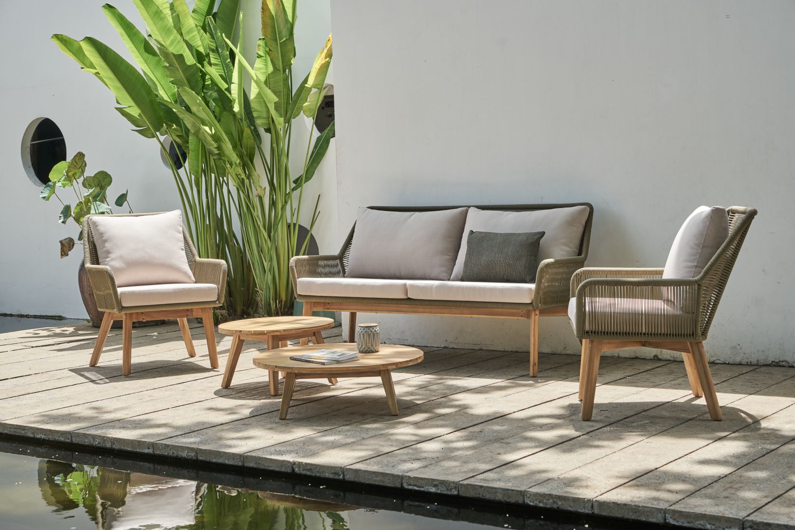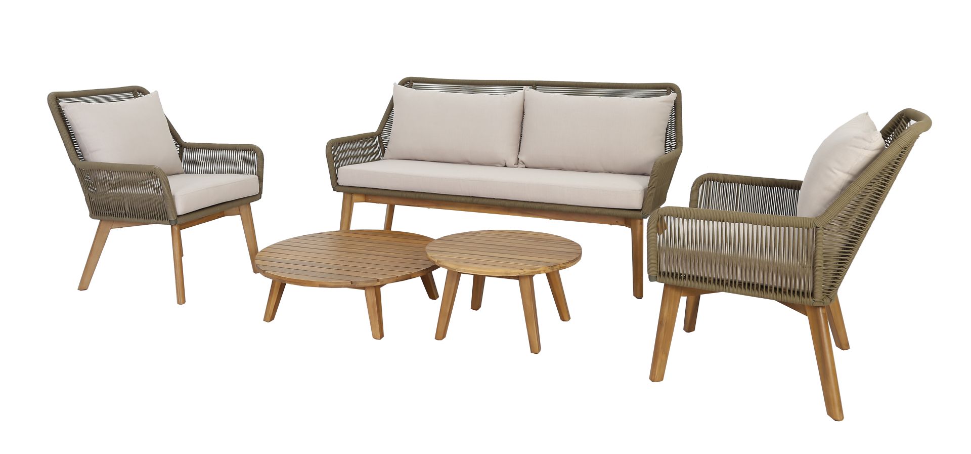Ένα lounge set 5-τεμαχίων, αποτελούμενο από: 2 πολυθρόνες lounge διαστάσεων 70×81,5x87cm, 1 καναπέ lounge 2-θέσιο διαστάσεων 170×81,5x87cm, 1 κεντρικό τραπεζάκι καφέ διαστάσεων oslash;80x25cm και ακόμη 1 κεντρικό τραπεζάκι καφέ διαστάσεων oslash;60x33cm. Ο σκελετός είναι κατασκευασμένος από μασίφ ξύλο ακακίας FSC σε απόχρωση ξύλου teak και χάλυβα πλεγμένος με στρογγυλό σχοινί σε λαδί χρώμα. Natural taupe μαξιλάρια με outdoor ύφασμα. Τα διακοσμητικά μαξιλάρια δεν συμπεριλαμβάνονται.