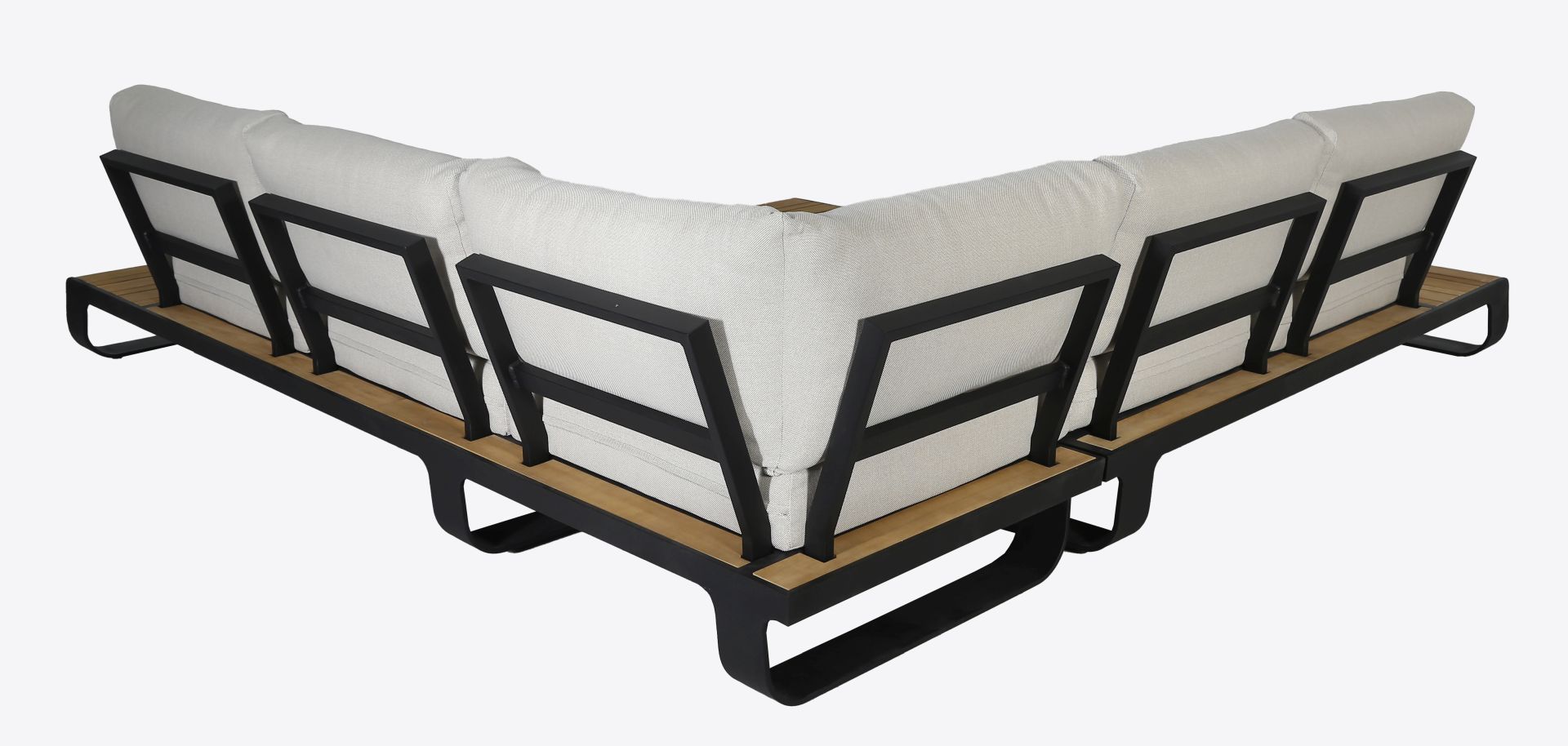Ένα lounge γωνιακό set 3-τεμαχίων, αποτελούμενο από: 1 καναπέ lounge διαστάσεων 184×82,5x62cm, 1 καναπέ lounge διαστάσεων 266,5×82,5x62cm και 1 κεντρικό τραπεζάκι καφέ διαστάσεων 91x83x24cm. Ο σκελετός είναι κατασκευασμένος από αλουμίνιο σε ανθρακί χρώμα. Τα ξύλινα μέρη είναι από μασίφ ξύλο teak. Γκρι μαξιλάρια με outdoor ύφασμα. Τα διακοσμητικά μαξιλάρια δεν συμπεριλαμβάνονται.