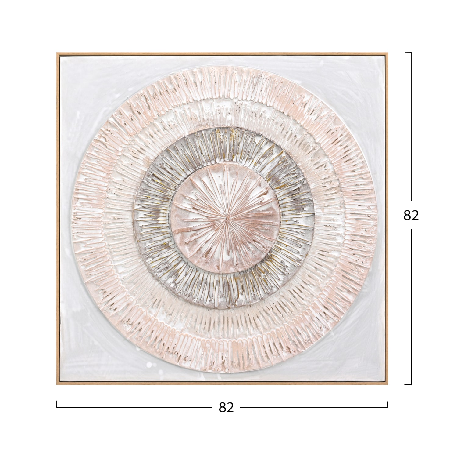 Ανάμεσα σε όλα τα διακοσμητικά στοιχεία, τα έργα τέχνης και ειδικά οι πίνακες ζωγραφικής παίζουν εξέχοντα ρόλο: όχι μόνο προσθέτουν χρώμα και αισθητική ομορφιά, αλλά δίνουν επίσης βάθος και νόημα στον χώρο μας. Ένας πίνακας μεταμορφώνει τον τρόπο που αντιλαμβανόμαστε έναν χώρο. Διακοσμήστε, λοιπόν, τον χώρο σας με έναν από τους καινούργιους πίνακες που προστέθηκαν στην γκάμα μας! Αυτός ο τετράγωνος πίνακας απεικονίζει ομόκεντρους κύκλους και είναι ζωγραφισμένος 100% με το χέρι σε ανοιχτά χρώματα, με κυρίαρχα το ΜΠΕΖ και το ΛΕΥΚΟ. Η κορνίζα είναι από πολυστυρένιο σε ΜΠΕΖ χρώμα. Το ιδιαίτερο χαρακτηριστικό αυτού του πίνακα είναι η τρισδιάστατη (3D) υλοποίησή του.