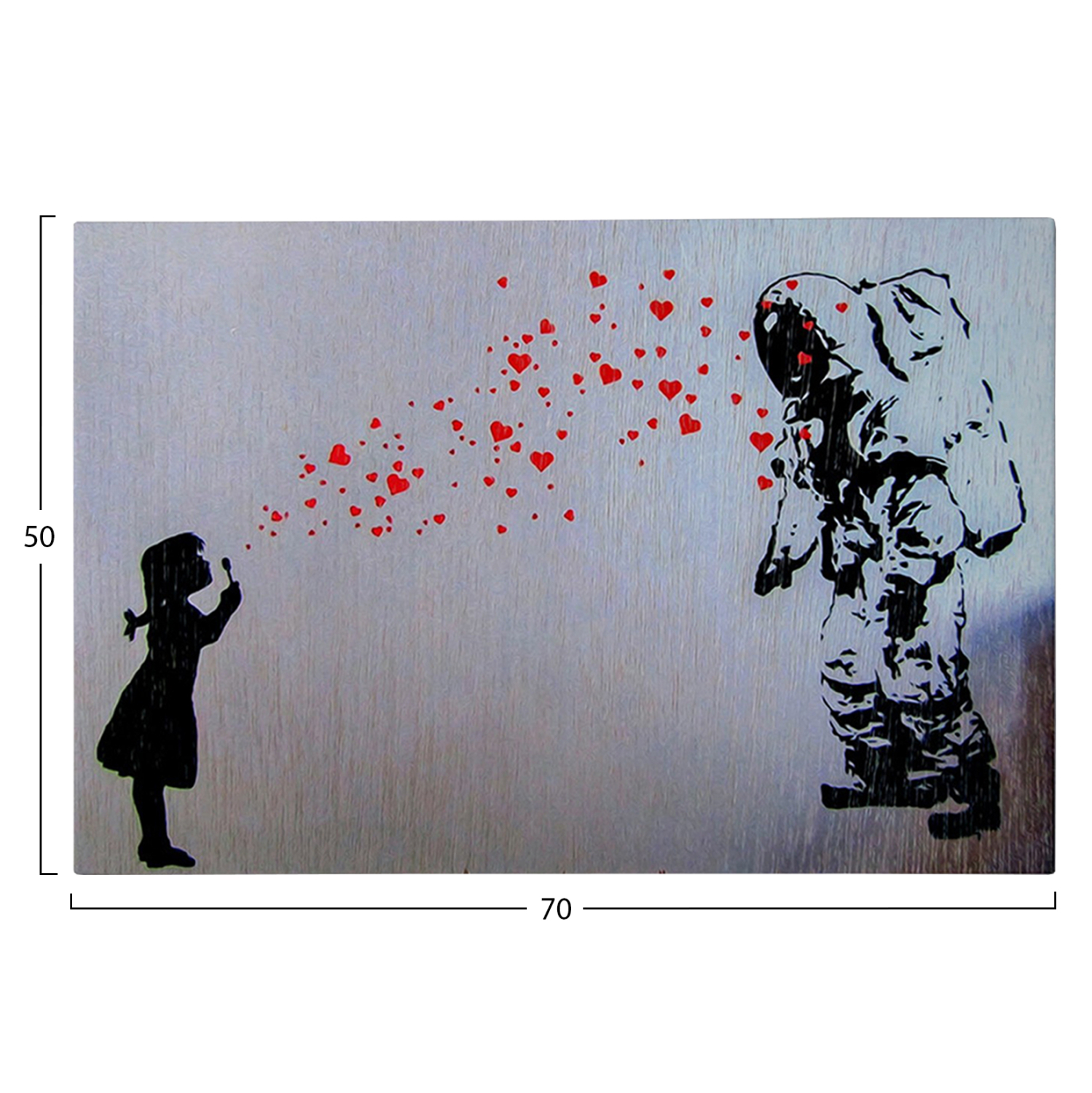 Ένας πίνακας τοίχου μεταμορφώνει τον τρόπο που αντιλαμβανόμαστε έναν χώρο. Διακοσμήστε, λοιπόν, τον χώρο σας με την καινούργια σειρά πινάκων τοίχου GOBI! Αυτός ο ασπρόμαυρος πίνακας που απεικονίζει ένα κορίτσι να στέλνει κόκκινες καρδούλες σε αστροναύτη, έχει υλοποιηθεί σε ψηφιακά εκτυπωμένο καμβά (50% βαμβάκι-50% πολυεστέρας) σε πλαίσιο από ξύλο.