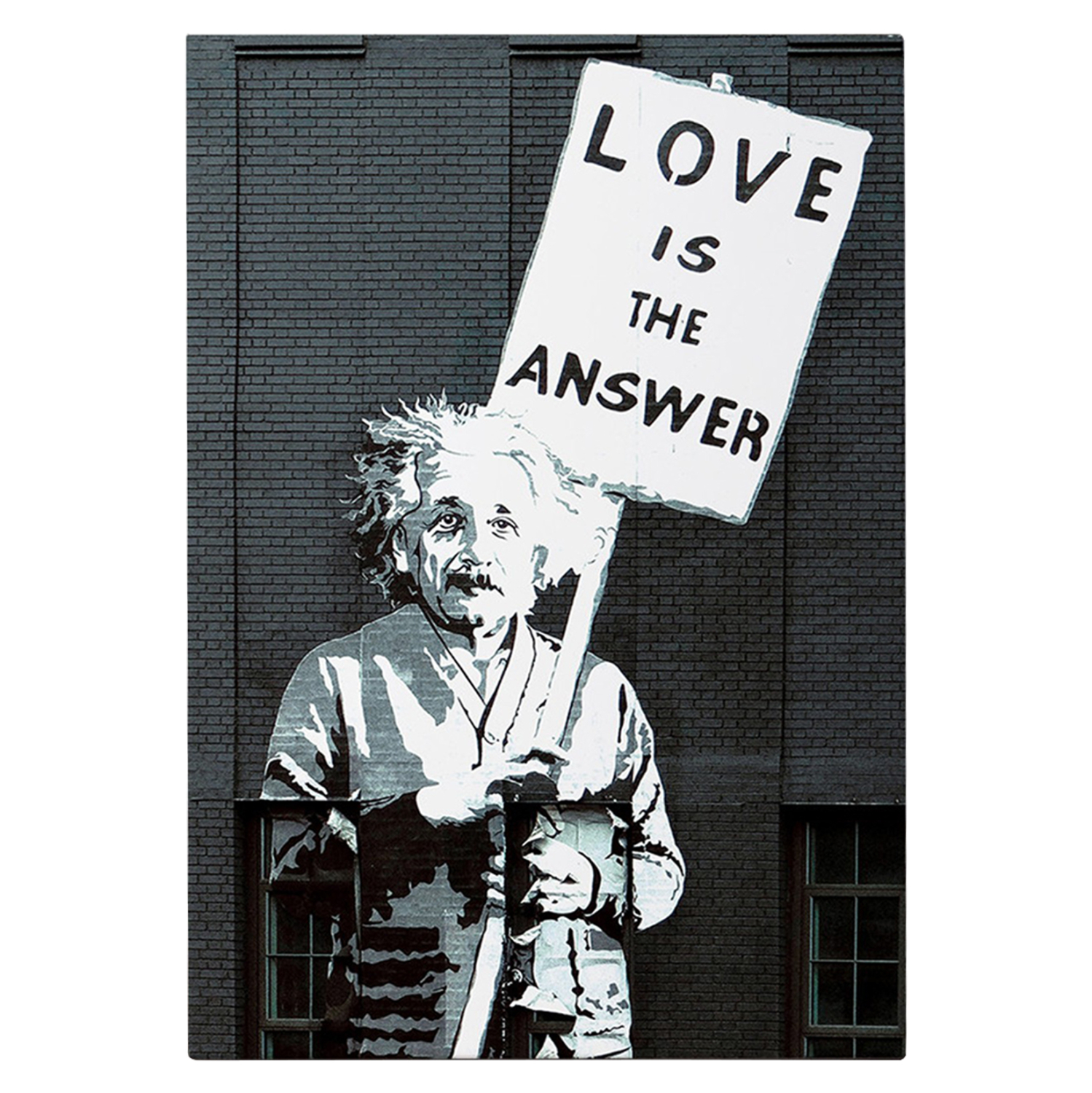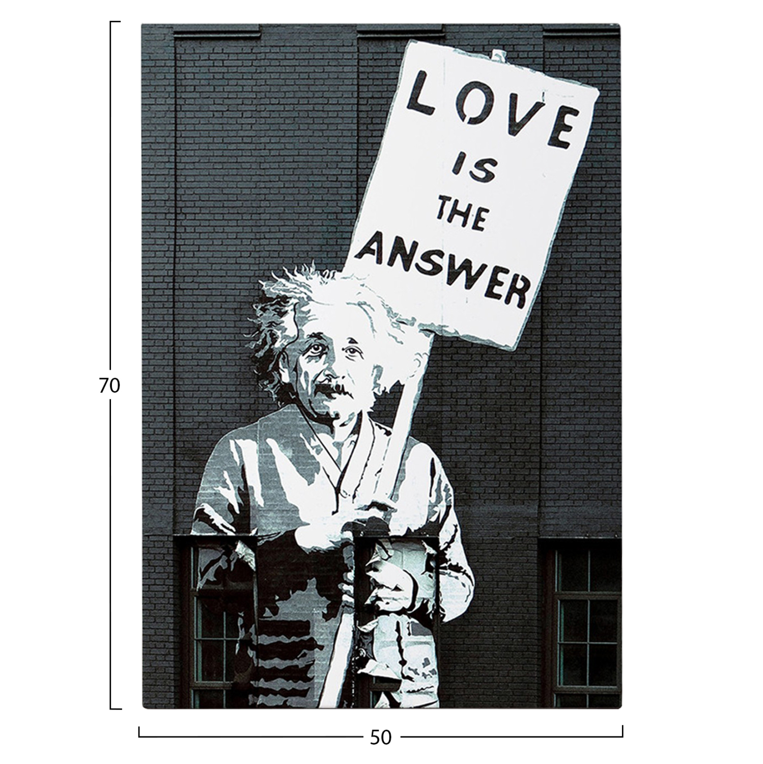 Ένας πίνακας τοίχου μεταμορφώνει τον τρόπο που αντιλαμβανόμαστε έναν χώρο. Διακοσμήστε, λοιπόν, τον χώρο σας με την καινούργια σειρά πινάκων τοίχου GOBI! Αυτός ο ασπρόμαυρος πίνακας που απεικονίζει μια τοιχογραφία του Αϊνστάιν να κρατάει πλακάτ, έχει υλοποιηθεί σε ψηφιακά εκτυπωμένο καμβά (50% βαμβάκι-50% πολυεστέρας) σε πλαίσιο από ξύλο.
